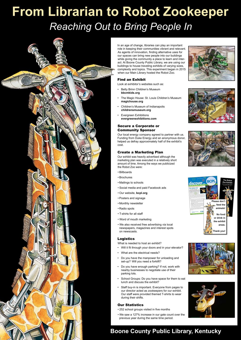 | dc.description.abstract | In the Fall of 2015, the Boone County Public Library embarked on a brainstorming project to find ways to use our library space in new and innovative ways. Ultimately, we wanted to connect with not only our core users but with those in the area who would not normally visit our institution. Our library collaborated with our community partner, Duke Energy to obtain funding that allowed us to be the first library system to display the Robot Zoo exhibit. The exhibit, normally found in museum spaces, is an interactive robotics display with a goal of connecting young users with the concepts of robotics and the core elements of STEM (science, technology, engineering and math). As a suburban library system, many members of our community do not have in the immediate area the opportunity to visit a museum that offers free exhibits in close proximity and which are of interest to all ages within a family. Partnerships with local schools has brought 2500 students to our library and attendance has increased by 227%. Our library system is now seeking out other interactive exhibits which will turn our libraries into dynamic places of learning, fun and collaboration. | en |
