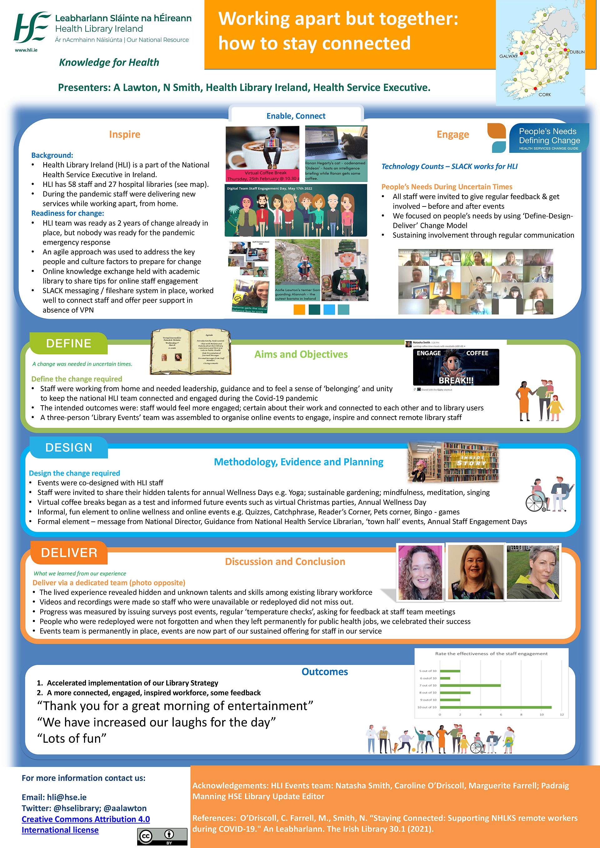 Health Library Ireland is a national service part of Ireland's Health Service Executive. It comprises a distributed team of staff working throughout the country. During the COVID-19 pandemic, it was more important than ever for library staff to remain connected, engaged and inspired. The method used to deliver events was based on the HSE approach to change which involves three stages: define, design and deliver. The needs of staff were clear at the start, everyone needed a way to connect with each other, to feel supported and inspired. A three person library assistant team was assembled to co-design events with library staff. All staff were invited to share their talents during events such as organic gardening, yoga, singing and creation of quizzes. Different types of events were delivered such as weekly virtual coffee breaks; an annual staff wellness morning; an annual staff engagement day and a Christmas event. Feedback from all events was captured using surveys and through messages to the Events team. In conclusion the Events team is a permanent fixture of Health Library Ireland and because these events were so successful they have