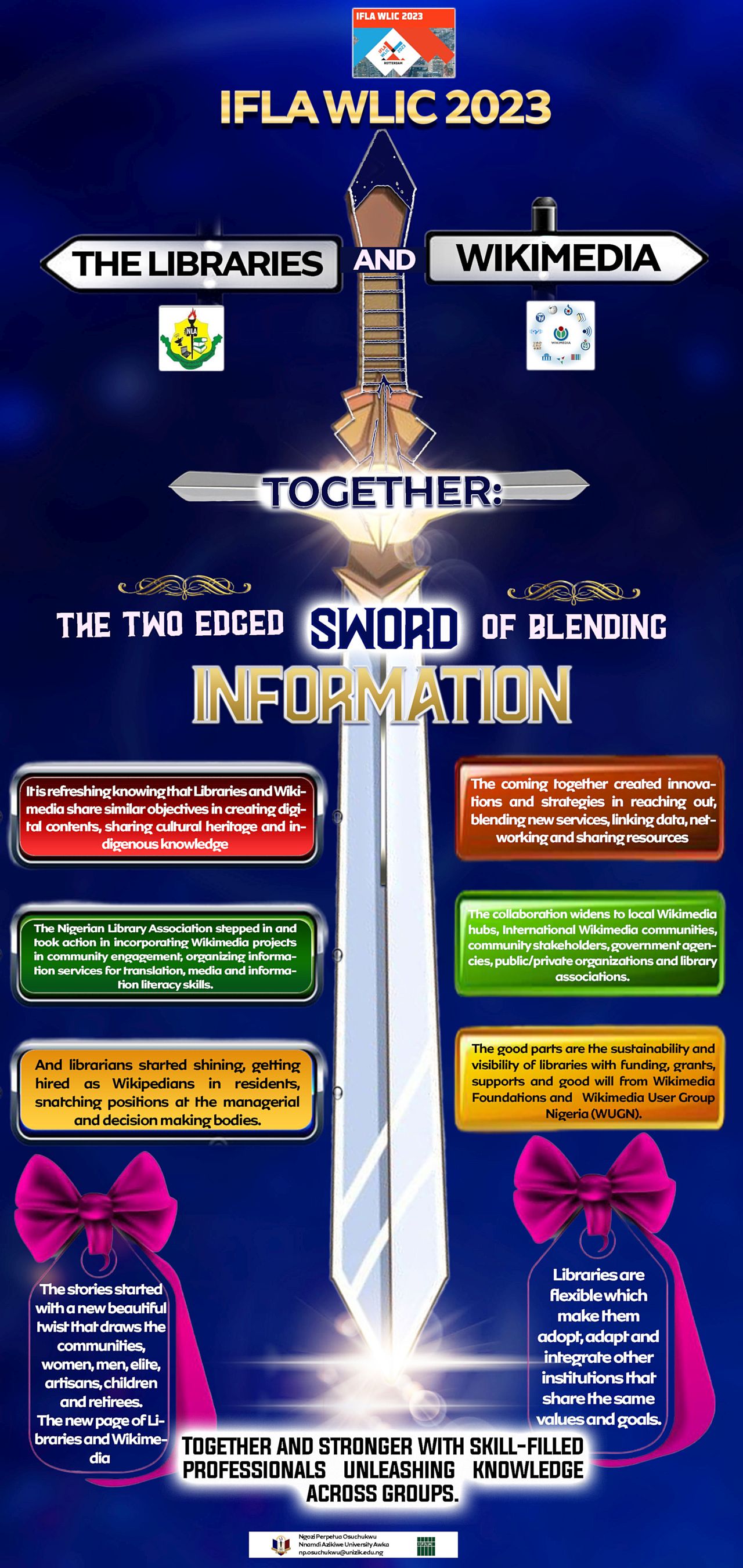 Libraries revel in new services and sharing of unique content. It was, therefore pure joy for librarians and libraries in Nigeria when they blended with Wikimedia and started telling new stories with activities that mix, mash, and, meld. It is not an overstatement to mention that libraries are flexible institutions that adopt, adapt, and integrate different formats that suit every era. As the global trend is about information in digital content, there is a need for the transformation of information resources, while mingling with organizations that share the same values and goals. Here comes, Wikimedia. The Nigerian Library Association, Anambra State Chapter stepped into the creation of digital content, translation and upload of indigenous knowledge into Wikimedia. The librarians were trained with grants and resources from Wikimedia Foundation and User Groups. They started training the community members, professionals, Faculties, and students on media, and information literacy skills. More community-driven initiatives and collaborations were drawn to support libraries on community knowledge. There are activities on cultural heritage, linking data, resource sharing, networking, open access with accurate and authentic sources. The librarians are now championing Wikimedia activities on digital content creation. The journey has just begun and the information is unlimited.