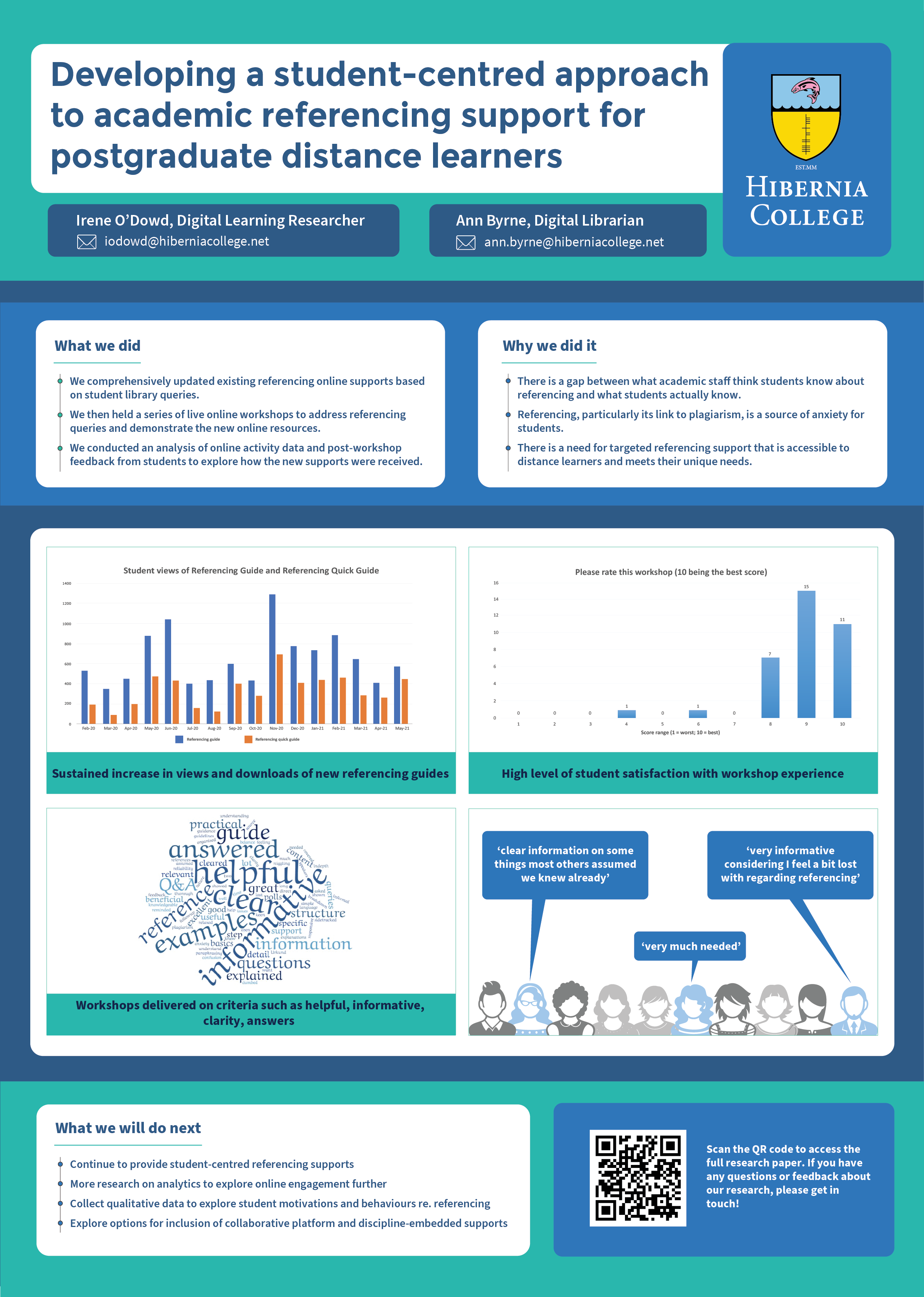 In Hibernia College, students are expected to take primary responsibility for maintaining academic integrity in their studies. However, lecturers and support staff have an important role to play in educating students about academic integrity and helping them develop the skills needed to practise it. This poster describes a project initiated by the Digital Learning Department (DLD) to improve the College’s online referencing supports, in response to the high volume of referencing queries being received daily by the Digital Librarian. Recent changes to the focus of capstone research projects on Hibernia’s Professional Master of Education programmes, combined with the move to fully online instruction during the Covid-19 pandemic, further highlighted the urgency of ensuring that these resources met students’ needs. The project consisted of a comprehensive update of the College’s core Referencing Guide and the delivery of a series of live drop-in webinar workshops to address specific referencing queries. The project was informed by research literature on online social presence and academic literacies. A preliminary data analysis provides indications of student engagement with and responses to the new supports.