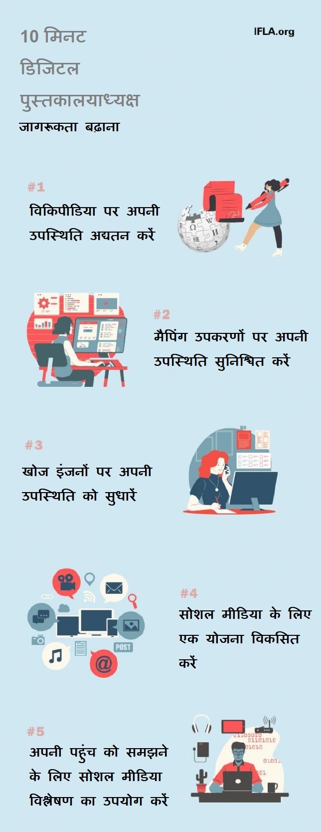 महामारी ने समुदायों तक पहुंचने और उनकी सेवा करने के साधन के रूप में डिजिटल उपकरणों के महत्व को रेखांकित किया है। हालाँकि, पुस्तकालय क्षेत्र में कई लोगों के लिए, डिजिटल उपकरणों के साथ काम करना स्पष्ट रूप से कोई नई बात नहीं है। इसके लिए धन्यवाद, साझा करने के लिए बहुत सारी विशेषज्ञता और अनुभव है! इफ्ला की 10-मिनट की डिजिटल पुस्तकालयाध्यक्ष श्रृंखला इस विशेषज्ञता और '23 चीज़ें' जैसी पिछली पहलों पर आधारित है, ताकि उन चीज़ों के लिए विचार प्रदान किया जा सके जिनके बारे में आप सोच सकते हैं, या आज़मा सकते हैं। इफ्ला के नीति और वकालत ब्लॉग पर अलग-अलग पोस्ट डाले जाते हैं, लेकिन आप यहां श्रृंखला के प्रत्येक भाग के लिए पूर्ण इन्फोग्राफिक्स तक पहुंच सकते हैं ! श्रृंखला का पहला भाग पुस्तकालयों, उनकी सेवाओं और उनके संग्रह के बारे में संचार करने और जागरूकता बढ़ाने के लिए डिजिटल उपकरणों का उपयोग करने पर केंद्रित है।