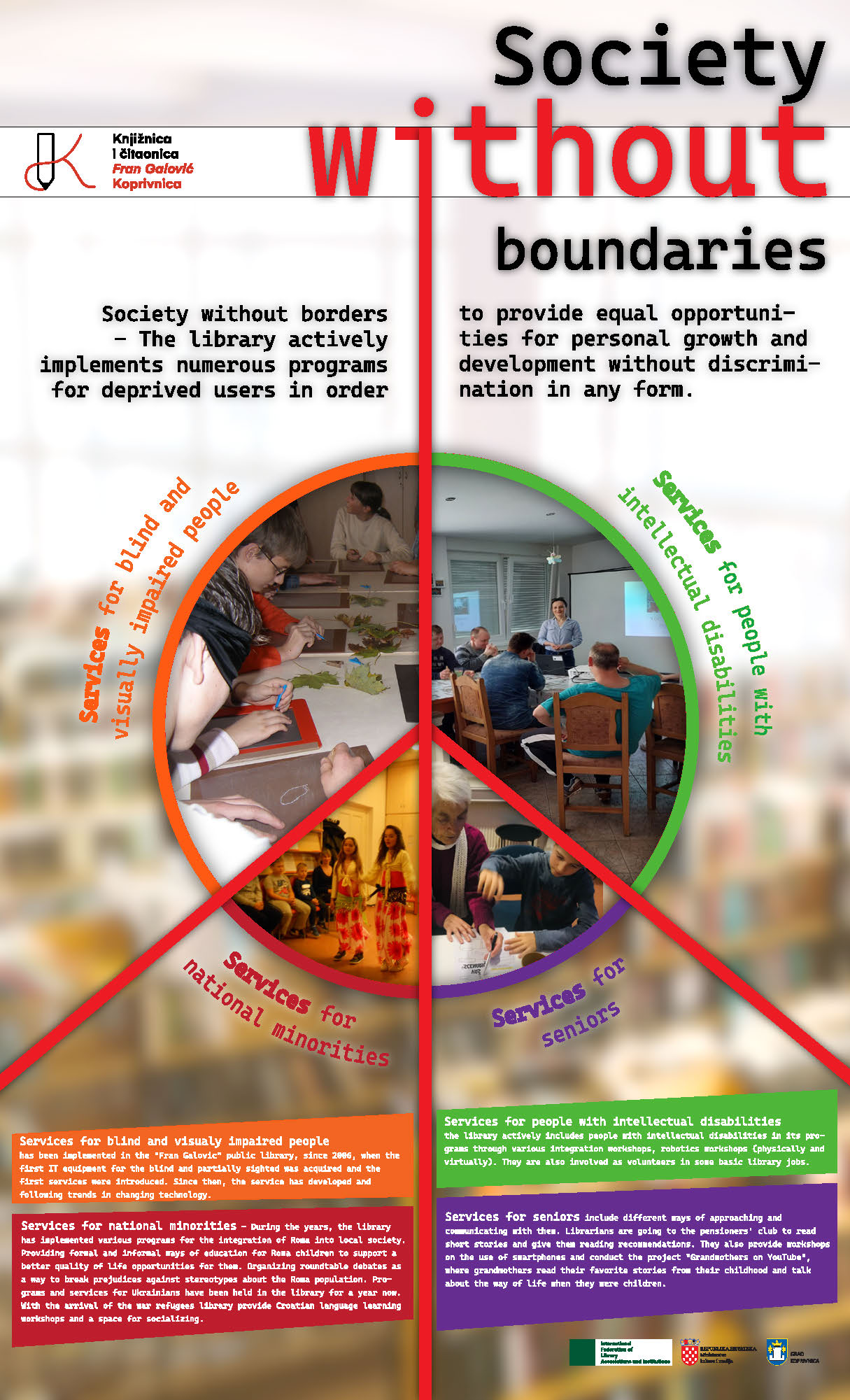 | dc.description.abstract | The poster shows the influence of the library on the local community through its influence on different deprived groups and the importance of cooperation and their inclusion in the programs and activities carried out by the library. It connects the need for the education of librarians outside the narrow librarian field with different professional and scientific disciplines. Through the communication and synergy of librarianship with UX, robotics, and the entertainment industry of games as some examples in addition to the traditional function, the increasing entry into other areas and the involvement of librarians through education and action on deprived groups who are not able to meet new technologies, to be educated within their area of interest, to provide elementary knowledge of using new technologies. The library is the heart of local communities. It connects different people from different social groups without any kind of judgment. Promoting SDTs through library activities, spreading goals and values among local society, and encouraging awareness of the needs of socially deprived people, people with special needs, blind and visually impaired people, and seniors as target groups that the library focuses on. | en_US |