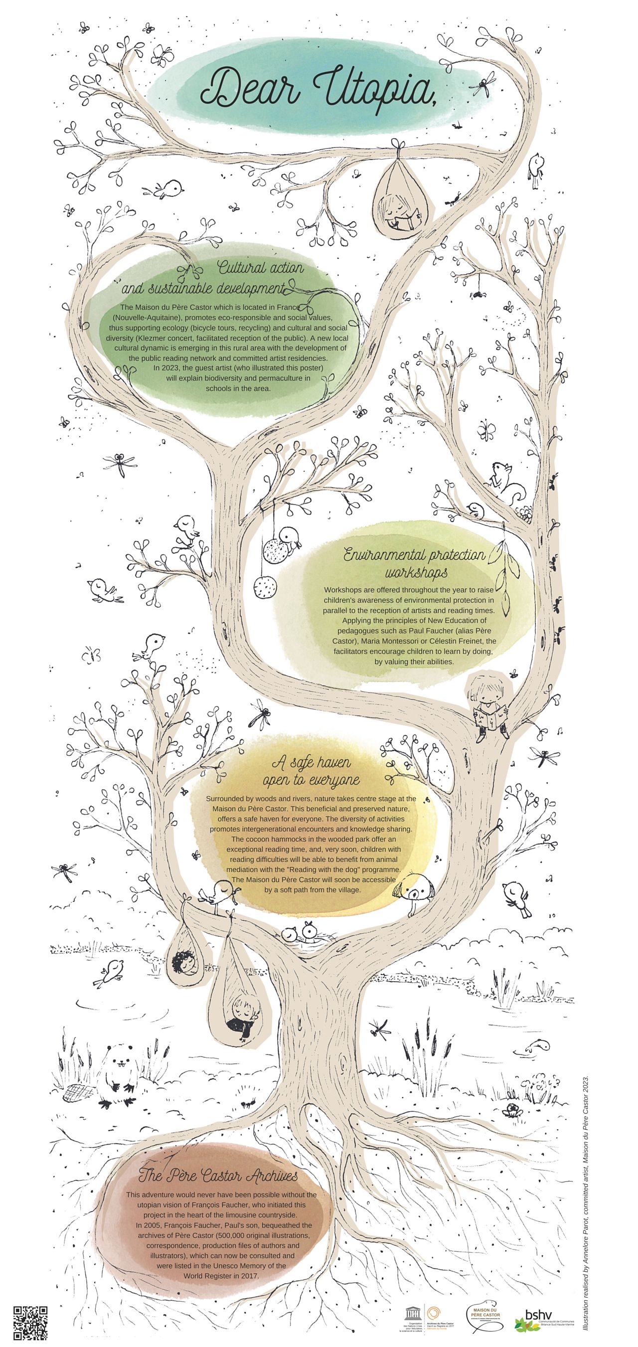 The “Maison du Père Castor” located in the heart of the limousine countryside (FRANCE) promotes eco-responsible and social values. Workshops are offered throughout the year to raise children’s awareness of environmental protection in parallel to the reception of committed artists and reading time. Applying the principles of New Education of pedagogues such as the Père Castor or Maria Montessori, the facilitators encourage children to learn by doing, by valuing their abilities. Surrounded by woods and rivers, nature takes centre stage at the “Maison du Père Castor”. This beneficial and preserved nature offers a safe haven for everyone. The diversity of activities promotes intergenerational encounters and knowledge sharing. The cocoon hammocks in the wooded park offer an exceptional reading time, and, very soon, children with reading difficulties, will be able to benefit from animal mediation with the “Reading with the dog” programme. The “Maison du Père Castor” will be soon accessible by a soft path from the village. This adventure would never have been possible without the utopian vision of Paul Faucher, who kept since 1930 the original illustrations, the correspondence, the production files of authors and illustrators, which are listed since 2017 in the UNESCO Memory of the World Register