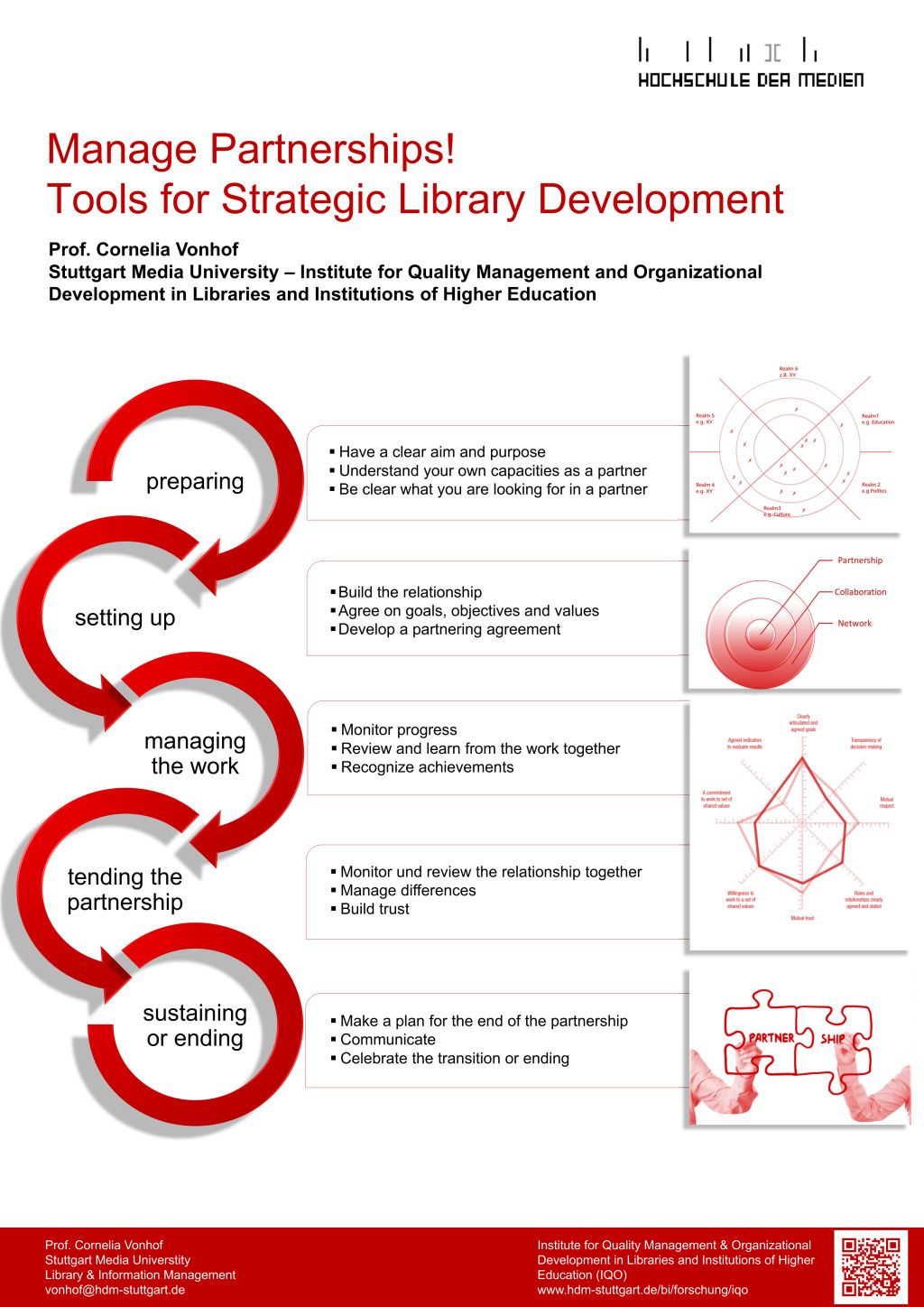 | dc.description.abstract | Strategically selected and sustainably nurtured partnerships, alliances and networks are indispensable resources for organizations, whether in the public or the private sector. This therefore also applies for public and academic libraries of all sizes. But if so, then it is necessary, to develop and maintain these relationships systematically and deliberately through partnership management. Many libraries already collaborate with external partners, but very few have a strategic and professional way of working with partners. The poster presents instruments and procedures for partnership management. | en |
