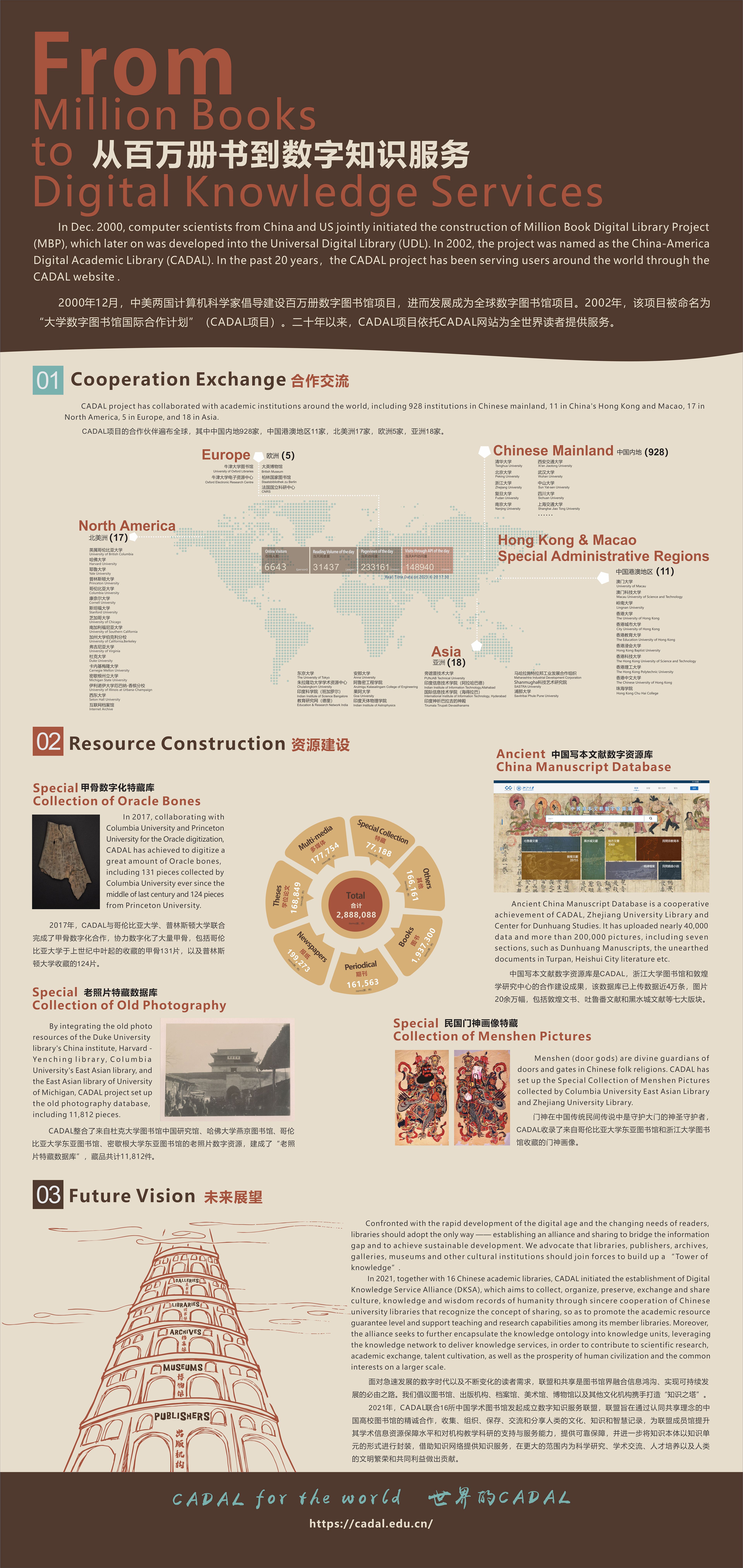 from digital library to smart library. Since 2002, the China Academic Digital Associative Library (CADAL) project, which is one of the typical representatives of academic digital libraries in China, has given full play to its role as a link and a bridge. With more than 20 years' joint efforts of 939 academic libraries in China and 40 libraries in Asia, North America and Europe, CADAL has finally built into a digital library with more than 2.8 8 million electronic re sources in Chinese and English. Confronted with the rapid development of the digital age and the changing needs of readers, the digital cooperation of CADAL was upgraded and the Digital Knowledge Service Alliance was officially established in 2021. The alliance focuses on four aspects of cooperation: digital retrospective of