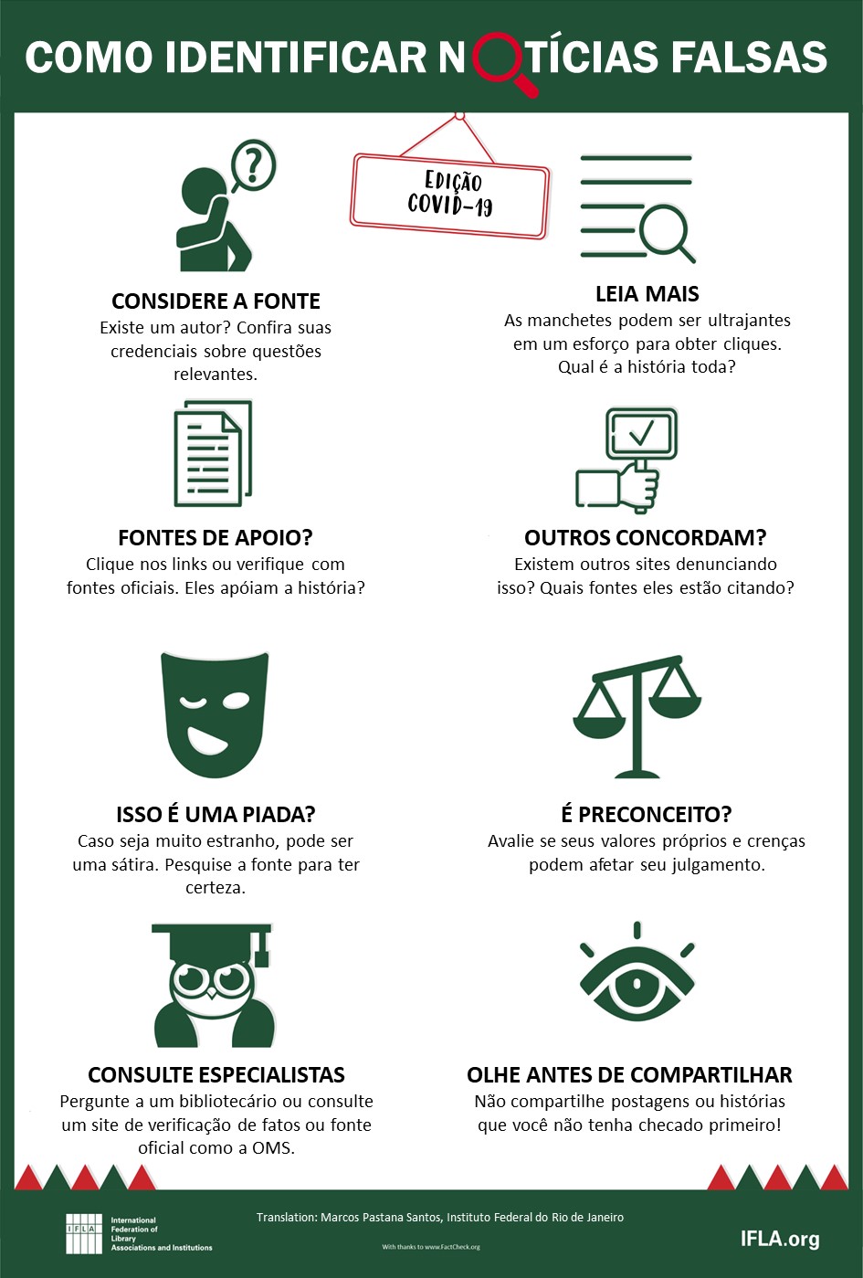 IFLA has produced a COVID-19 edition of our popular How To Spot Fake News infographic, with a stronger focus on some of the issues encountered around the pandemic – especially the need to check with other sources – and recognition of the fact that much news today spreads through conversations on social media.