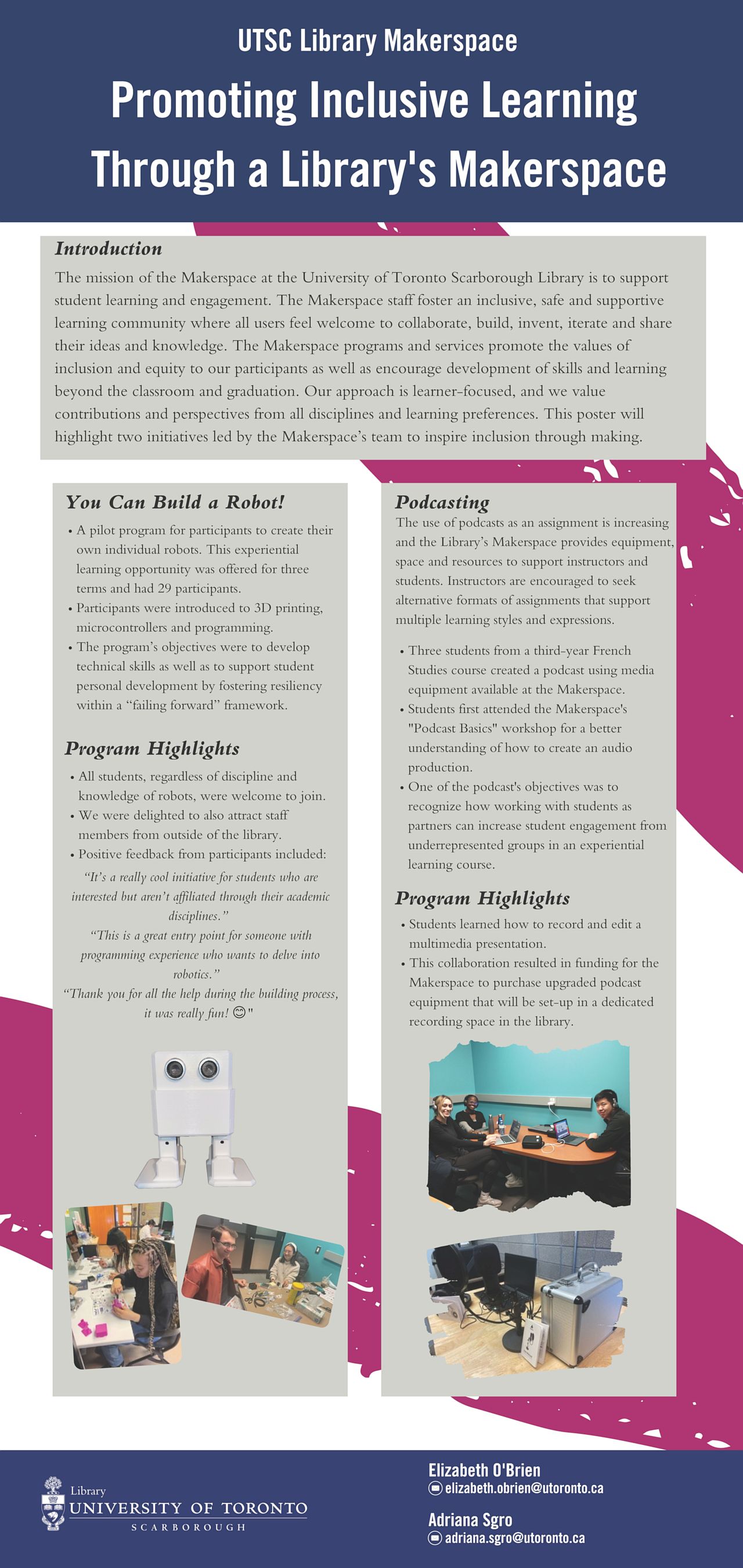 The mission of the Makerspace at the University of Toronto Scarborough Library is to support student learning and engagement. The Makerspace staff foster an inclusive, safe and supportive community where all users feel welcome to collaborate, build, invent, iterate and share their ideas and knowledge. We aligned our vision with our campus's strategic plan for "Inspiring Inclusive Excellence". Within this framework, the Makerspace's team delivers programming, workshops and events that inspires belongingness and celebrates the diverse ways of knowing and methods of knowledge translation. This poster will highlight several initiatives led by the Makerspace's team to inspire inclusion through making. Our “You Can Build a Robot” program introduces robotics to an interdisciplinary group of staff and students with limited knowledge of coding and micro-controllers. Although one of the program's objectives is to develop technical skills in these areas, another important objective is to foster resiliency within a “failing forward” framework. We will also showcase our initiative to support podcasting assignments. Instructors are encouraged to seek alternative formats of assignments that support multiple learning styles and expressions. The use of podcasts as an assignment is increasing and the Library's Makerspace provides equipment, space and resources to support instructors and students.