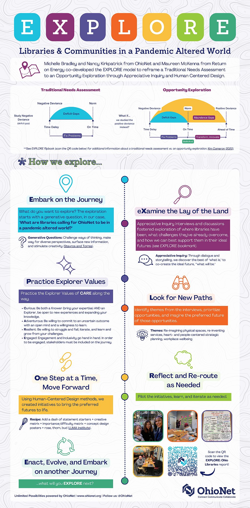 Covid-19 has undeniably changed how libraries operate and the lives of individuals in our communities. Libraries and library support organizations have done stellar work to respond to the constant changing circumstances brought about by the pandemic. Despite struggles, there were many instances of innovation and everyday heroism. Although the pandemic is not yet past us, it has changed our worlds forever. Now is the time to be proactive, rather than reactive. To uncover the "best of" innovations that were made at the height of the pandemic so that we can build on their successes, and to "pro-actively and thoughtfully" assess the needs of libraries and communities in our new reality. To ask ourselves "What are communities calling for libraries to be?" "What are libraries calling for support organizations to be?" We created a model, called EXPLORE that utilizes the methods of Appreciative Inquiry and Human Centered Design to flip the traditional "needs assessment" which looks for the "deficit gaps" to an "opportunity exploration" which builds on the "abundance gap". This poster will present the EXPLORE model and how it can be used by libraries and library support organizations to explore the new opportunities that are present in our pandemic-altered world.