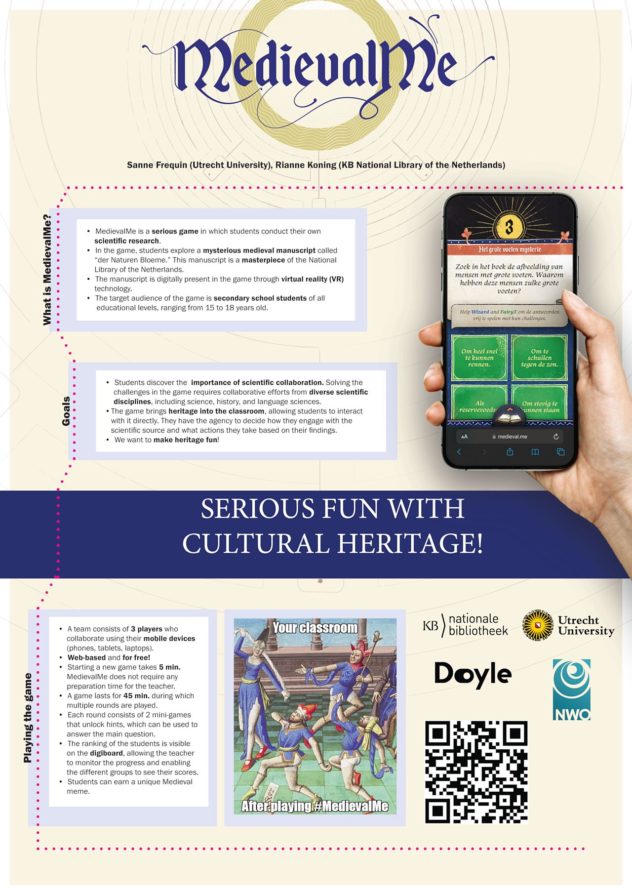 | dc.description.abstract | MedievalMe is an engaging serious game designed for secondary school students, aged 15 to 18. In this game they conduct their own research on a mysterious medieval manuscript. Through the implementation of virtual reality (VR) technology, the manuscript is brought to life within the game. By integrating heritage into the classroom, MedievalMe allows students to directly interact with cultural artifacts. The game is web-based and free, encouraging accessibility for all participants. It can be played on mobile devices. With a setup time of only 5 minutes, teachers can seamlessly initiate a new game without any additional preparation. The main objective of MedievalMe is to highlight the significance of interdisciplinary approaches. Students from various disciplines, including science, history, and language sciences, collaborate to solve the challenges presented in the game. MedievalMe comprises multiple rounds, each consisting of two mini-games that unveil valuable hints to progress towards answering the main question about the manuscript. The students' rankings are displayed on the digiboard, enabling the teacher to monitor progress and encouraging healthy competition among different groups. Overall, MedievalMe provides an immersive and collaborative platform that merges education, heritage, and scientific research, captivating students and promoting their research skills in an interactive and engaging manner. | en_US |