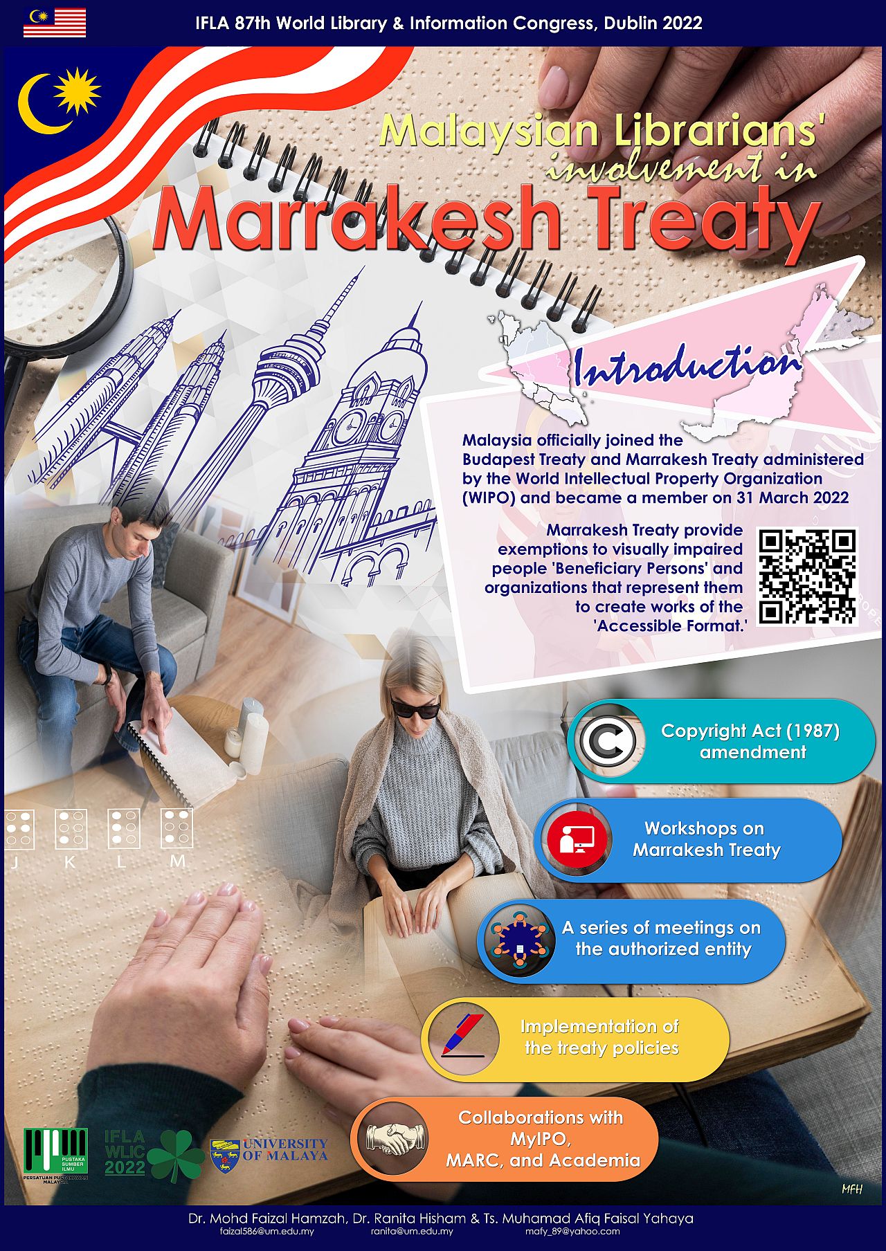 As the awareness of inclusive literacy is widespread nowadays, the Marrakesh Treaty has become one of the national agendas in many countries. No exception, Malaysia is moving toward to intersection with the treaty which aligns with the Malaysia Persons with Disabilities Act 2008. As information professionals, librarians should know very well the impact of the treaty in library fields. Therefore, the objective of this poster is to present the involvement of Malaysian librarians in rectifying the Marrakesh treaty. In making sure the success of the Marrakesh Treaty, the Malaysian Librarians Association, National Library of Malaysia and Academic Librarian have actively collaborated with several advocacy agencies such as Intellectual Property Corporation of Malaysia, Ministry of Tourism, Arts and Culture Malaysia and Ministry of Domestic Trade and Consumer Affairs. A series of discussions, workshops and meetings were set up to discuss the impact of the treaty, copyright and the strategies of implementation. One of the highly anticipated activities was the revision of the Malaysia Copyright Act. A series of awareness programs, workshops and publications were planned in making sure the success of the treaty. The involvement of Malaysian librarians showcases the dynamic roles of the librarian in supporting the Sustainable Development Goals and IFLA Strategy 2019-2024. Additionally, this involvement will build a strong presence among local and international organizations as a valued partner. Thus, this will strengthen the global voice of libraries.