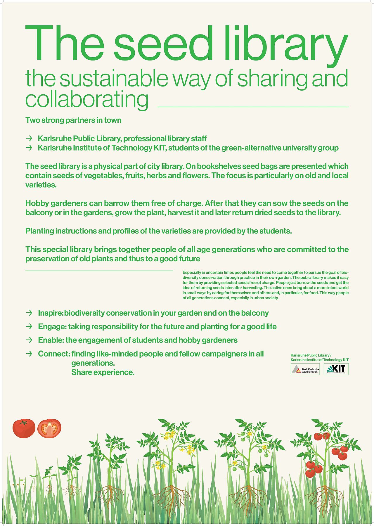 The seed library is a physical part of Karlsuhe City Library. On bookshelves seed bags are presented which contain seeds of vegetables, fruits and herbs. The focus is particularly on old and local varieties in order to preserve them. Hobby gardeners can borrow the seeds free of charge. After sowing, growing and harvesting they should bring back dried seeds to the library. A group of students makes sure that the seed circuit is working properly. This special library brings together people of all age generations who are committed to the preservation of plants and thus to a future worth living.
