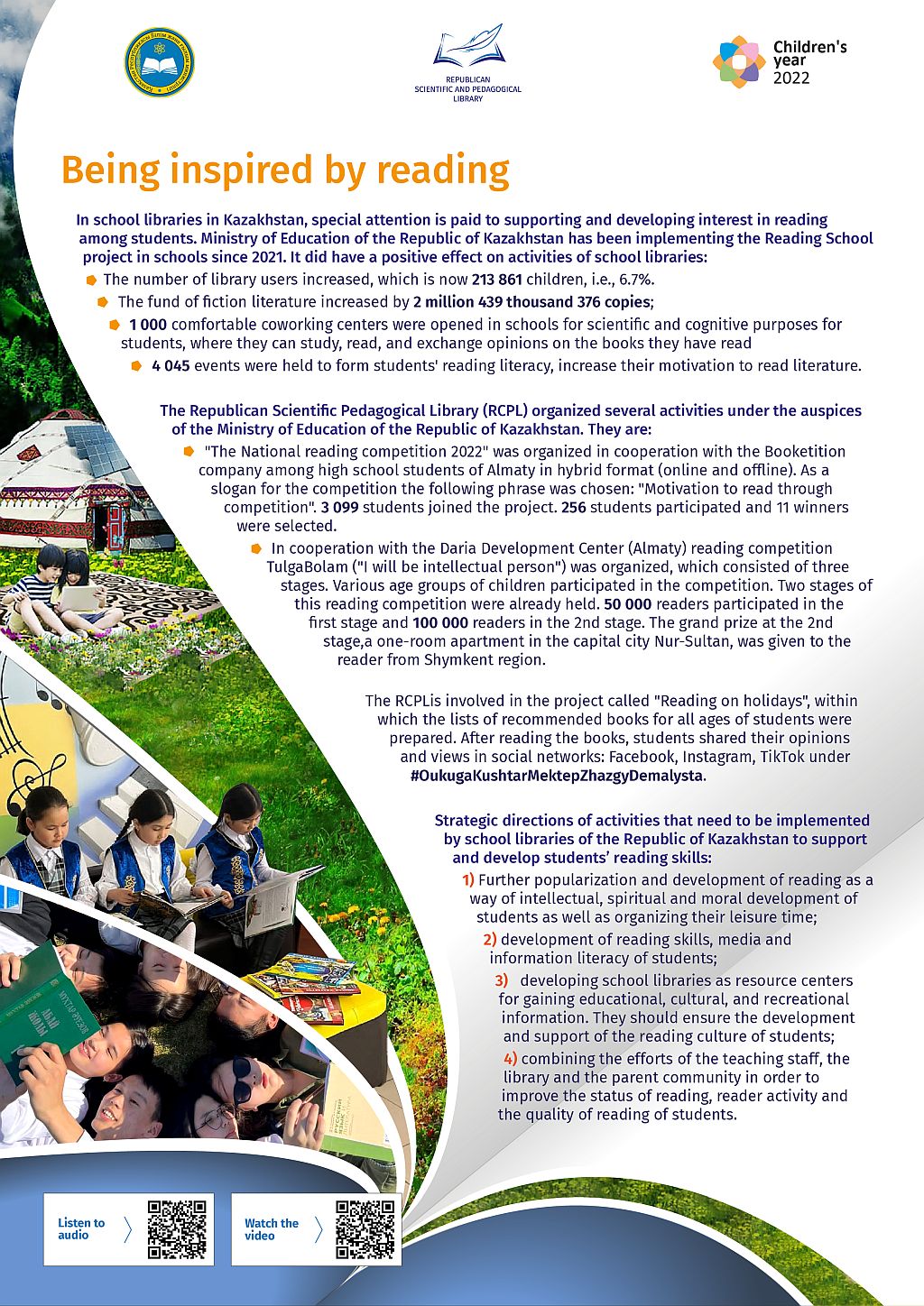 | dc.description.abstract | In school libraries in Kazakhstan, special attention is paid to supporting and developing interest in reading among students. Ministry of Education of the Republic of Kazakhstan has been implementing the Reading School project in schools since 2021. It did have a positive effect on activities of school libraries: - The number of library users increased, which is now 213 861 children, i.e., 6.7%. - The fund of fiction literature increased by 2 million 439 thousand 376 copies; - 1 000 comfortable coworking centers were opened in schools for scientific and cognitive purposes for students, where they can study, read, and exchange opinions on the books they have read - 4 045 events were held to form students' reading literacy, increase their motivation to read literature. The Republican Scientific Pedagogical Library (RCPL) organized several activities under the auspices of the Ministry of Education of the Republic of Kazakhstan. They are: - "The National reading competition 2022" was organized in cooperation with the Booketition company among high school students of Almaty in hybrid format (online and offline). As a slogan for the competition the following phrase was chosen: "Motivation to read through competition". 3 099 students joined the project. 256 students participated and 11 winners were selected. - In cooperation with the Daria Development Center (Almaty) reading competition TulgaBolam ("I will be intellectual person") was organized, which consisted of three stages. Various age groups of children participated in the competition. Two stages of this reading competition were already held. 50 000 readers participated in the first stage and 100 000 readers in the 2nd stage. The grand prize at the 2nd stage, a one-room apartment in the capital city Nur-Sultan, was given to the reader from Shymkent region. The RCPLis involved in the project called "Reading on holidays", within which the lists of recommended books for all ages of students were prepared. After reading the books, students shared their opinions and views in social networks: Facebook, Instagram, TikTok under #OukugaKushtarMektepZhazgyDemalysta. Strategic directions of activities that need to be implemented by school libraries of the Republic of Kazakhstan to support and develop students’ reading skills: 1) Further popularization and development of reading as a way of intellectual, spiritual and moral development of students as well as organizing their leisure time; 2) development of reading skills, media and information literacy of students; 3) developing school libraries as resource centers for gaining educational, cultural, and recreational information. They should ensure the development and support of the reading culture of students; 4) combining the efforts of the teaching staff, the library and the parent community in order to improve the status of reading, reader activity and the quality of reading of students. | en_US |