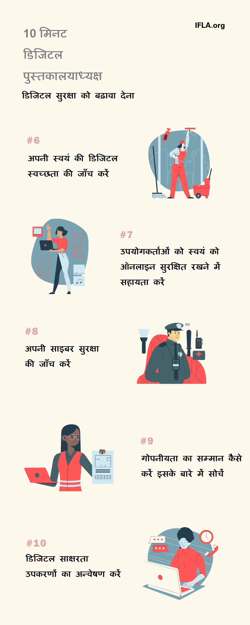 महामारी ने समुदायों तक पहुंचने और उनकी सेवा करने के साधन के रूप में डिजिटल उपकरणों के महत्व को रेखांकित किया है। हालाँकि, पुस्तकालय क्षेत्र में कई लोगों के लिए, डिजिटल उपकरणों के साथ काम करना स्पष्ट रूप से कोई नई बात नहीं है। इसके लिए धन्यवाद, साझा करने के लिए बहुत सारी विशेषज्ञता और अनुभव है! इफ्ला की 10-मिनट की डिजिटल पुस्तकालयाध्यक्ष श्रृंखला इस विशेषज्ञता और '23 चीज़ें' जैसी पिछली पहलों पर आधारित है, ताकि उन चीज़ों के लिए विचार प्रदान किया जा सके जिनके बारे में आप सोच सकते हैं, या आज़मा सकते हैं। इफ्ला के नीति और वकालत ब्लॉग पर अलग-अलग पोस्ट डाले जाते हैं, लेकिन आप यहां श्रृंखला के प्रत्येक भाग के लिए पूर्ण इन्फोग्राफिक्स तक पहुंच सकते हैं ! श्रृंखला का दूसरा भाग डिजिटल सुरक्षा और अपने लिए और अपने उपयोगकर्ताओं के लिए इसे प्राप्त करने के लिए आवश्यक कौशल पर केंद्रित है।
