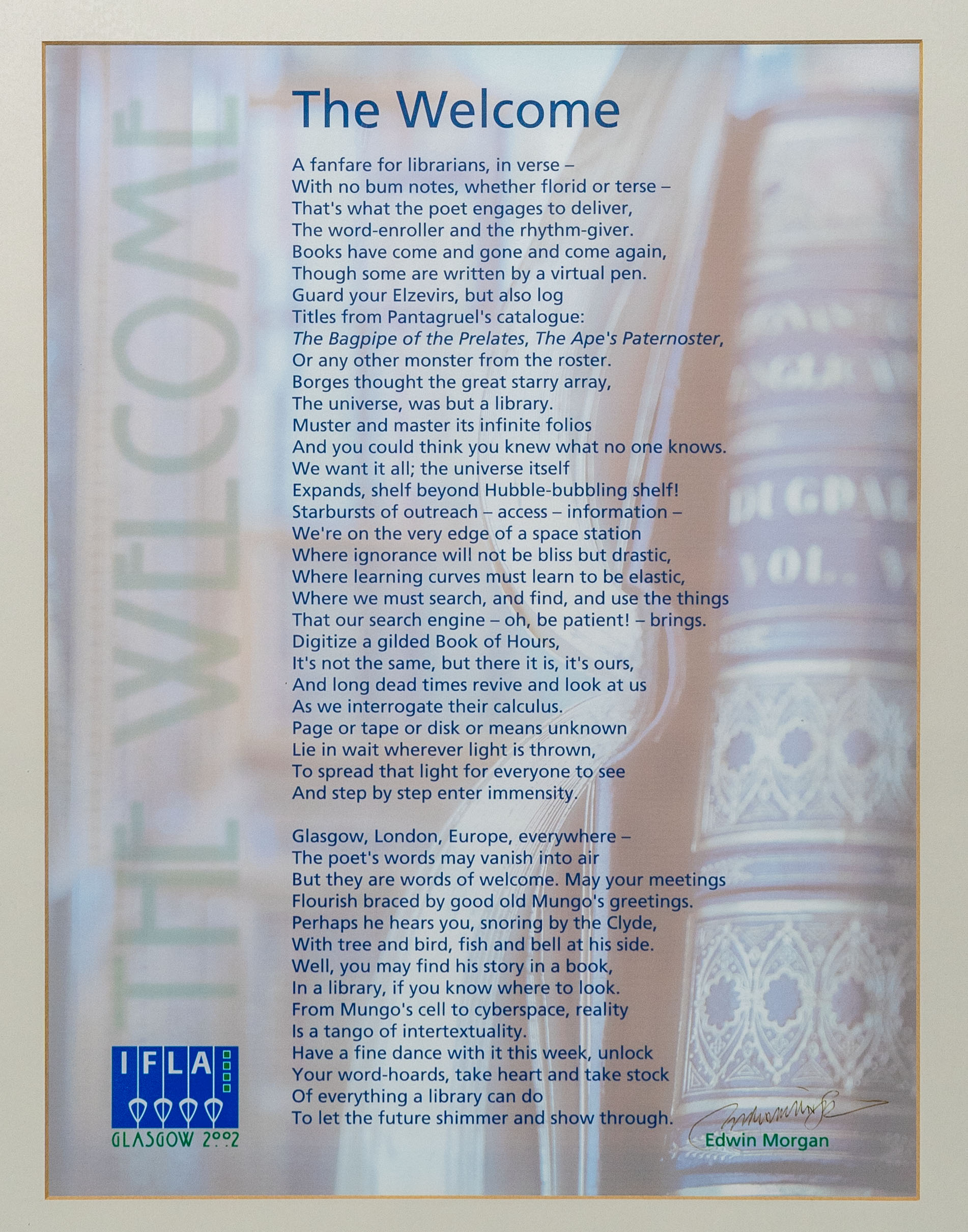 Glasgow-born poet, translator, playwright and critic Edwin George Morgan OBE FRSE (1920 – 2010), wrote 'The Welcome' specifically for the occasion of the IFLA Conference 2002, IFLA's 75th anniversary. Morgan was Poet Laureate for Glasgow at the time and later National Poet for Scotland [Makar]. Includes photograph of signed print, along with full text and explanatory notes from IFLA Journal. [The Welcome. (2002). IFLA Journal, 28(5-6), 235-235. https://doi.org/10.1177/034003520202800503]