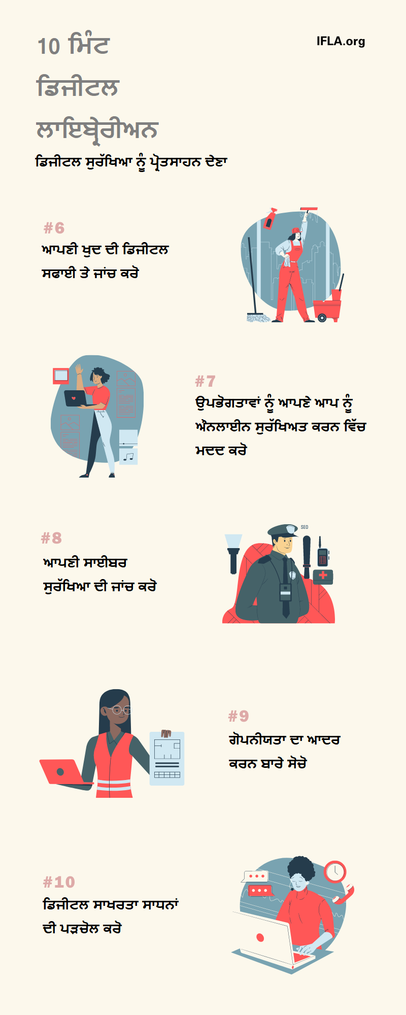 ਮਹਾਂਮਾਰੀ ਨੇ ਭਾਈਚਾਰਿਆਂ ਤੱਕ ਪਹੁੰਚਣ ਅਤੇ ਸੇਵਾ ਕਰਨ ਦੇ ਸਾਧਨ ਵਜੋਂ ਡਿਜੀਟਲ ਸਾਧਨਾਂ ਦੀ ਮਹੱਤਤਾ ਨੂੰ ਰੇਖਾਂਕਿਤ ਕੀਤਾ ਹੈ। ਹਾਲਾਂਕਿ, ਲਾਇਬ੍ਰੇਰੀ ਖੇਤਰ ਵਿੱਚ ਬਹੁਤ ਸਾਰੇ ਲੋਕਾਂ ਲਈ, ਡਿਜੀਟਲ ਟੂਲਸ ਨਾਲ ਕੰਮ ਕਰਨਾ ਸਪੱਸ਼ਟ ਤੌਰ ਤੇ ਕੋਈ ਨਵਾਂ ਨਹੀਂ ਹੈ। ਇਸਦਾ ਧੰਨਵਾਦ, ਇੱਥੇ ਸਾਂਝਾ ਕਰਨ ਲਈ ਬਹੁਤ ਸਾਰੀ ਮਹਾਰਤ ਅਤੇ ਅਨੁਭਵ ਹੈ ! IFLA ਦੀ 10-ਮਿੰਟ ਦੀ ਡਿਜੀਟਲ ਲਾਇਬ੍ਰੇਰੀਅਨ ਲੜੀ ਇਸ ਮੁਹਾਰਤ ਨੂੰ ਖਿੱਚਦੀ ਹੈ, ਅਤੇ ਪਿਛਲੀਆਂ ਪਹਿਲਕਦਮੀਆਂ ਜਿਵੇਂ ਕਿ '23 ਚੀਜ਼ਾਂ' ਉਹਨਾਂ ਚੀਜ਼ਾਂ ਲਈ ਵਿਚਾਰ ਪ੍ਰਦਾਨ ਕਰਨ ਲਈ ਜਿਨ੍ਹਾਂ ਬਾਰੇ ਤੁਸੀਂ ਸੋਚ ਸਕਦੇ ਹੋ, ਜਾਂ ਕੋਸ਼ਿਸ਼ ਕਰ ਸਕਦੇ ਹੋ। ਵਿਅਕਤੀਗਤ ਪੋਸਟਾਂ ਇਫ਼ਲਾ ਦੀ ਨੀਤੀ ਅਤੇ ਐਡਵੋਕੇਸੀ ਬਲੌਗ ਤੇ ਰੱਖੀਆਂ ਜਾਂਦੀਆਂ ਹਨ, ਪਰ ਇੱਥੇ ਤੁਸੀਂ ਲੜੀ ਦੇ ਹਰੇਕ ਹਿੱਸੇ ਲਈ ਪੂਰੇ ਇਨਫੋਗ੍ਰਾਫਿਕਸ ਤੱਕ ਪਹੁੰਚ ਕਰ ਸਕਦੇ ਹੋ ! ਲੜੀ ਦਾ ਦੂਜਾ ਭਾਗ ਡਿਜੀਟਲ ਸੁਰੱਖਿਆ ਅਤੇ ਆਪਣੇ ਲਈ ਅਤੇ ਆਪਣੇ ਉਪਭੋਗਤਾਵਾਂ ਲਈ ਇਸ ਨੂੰ ਪ੍ਰਾਪਤ ਕਰਨ ਲਈ ਲੋੜੀਂਦੇ ਹੁਨਰਾਂ ਤੇ ਕੇਂਦ੍ਰਿਤ ਹੈ।