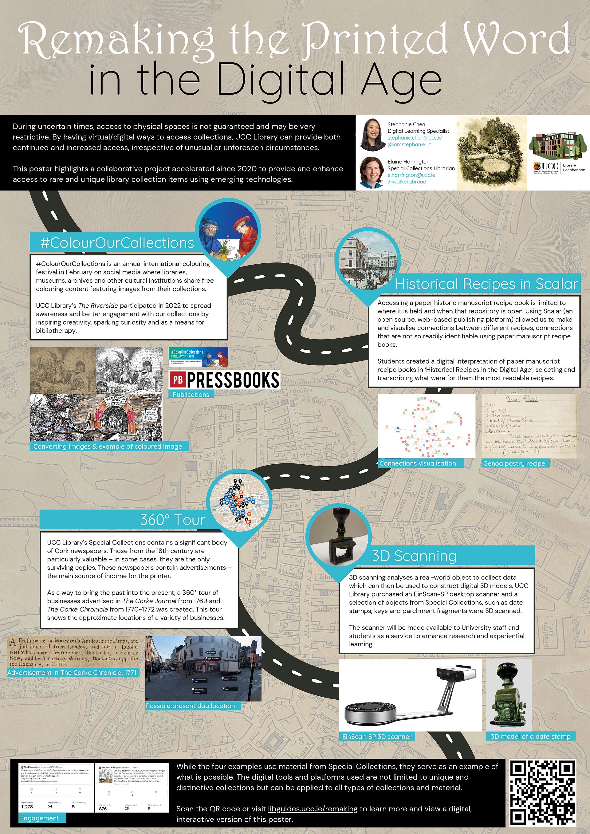 | dc.description.abstract | This poster highlights a collaborative project to enhance access to rare and unique library collection items using emerging technologies. It presents four examples of how UCC Library staff and students worked together using new digital tools/platforms to showcase material in Special Collections to inspire, engage, enable, and connect, especially in uncertain times. Special Collections and Archives have long-engaged with the community through social media (like Twitter @theriversideUCC), through physical exhibitions, digital collections, stand-alone events and seasonal guides communicating information about UCC Library's unique and distinctive collections. Recently, they partnered with the Library's Digital Learning Specialist to explore a selection of digital tools/platforms. These are: a 3D Scanner, a 360- degree camera, Pressbooks, and Scalar. The output of this cross-portfolio partnership was the creation of 3D models of various objects; an immersive, virtual tour of Cork city based on historical newspaper advertisements; an online colouring book published on Pressbooks; and a digital exhibit on historical recipes on Scalar. While the four examples use material from Special Collections, they serve as an example of what is possible. The digital tools and platforms used are not limited to unique and distinctive collections but can be applied to all types of collections and material. | en_US |