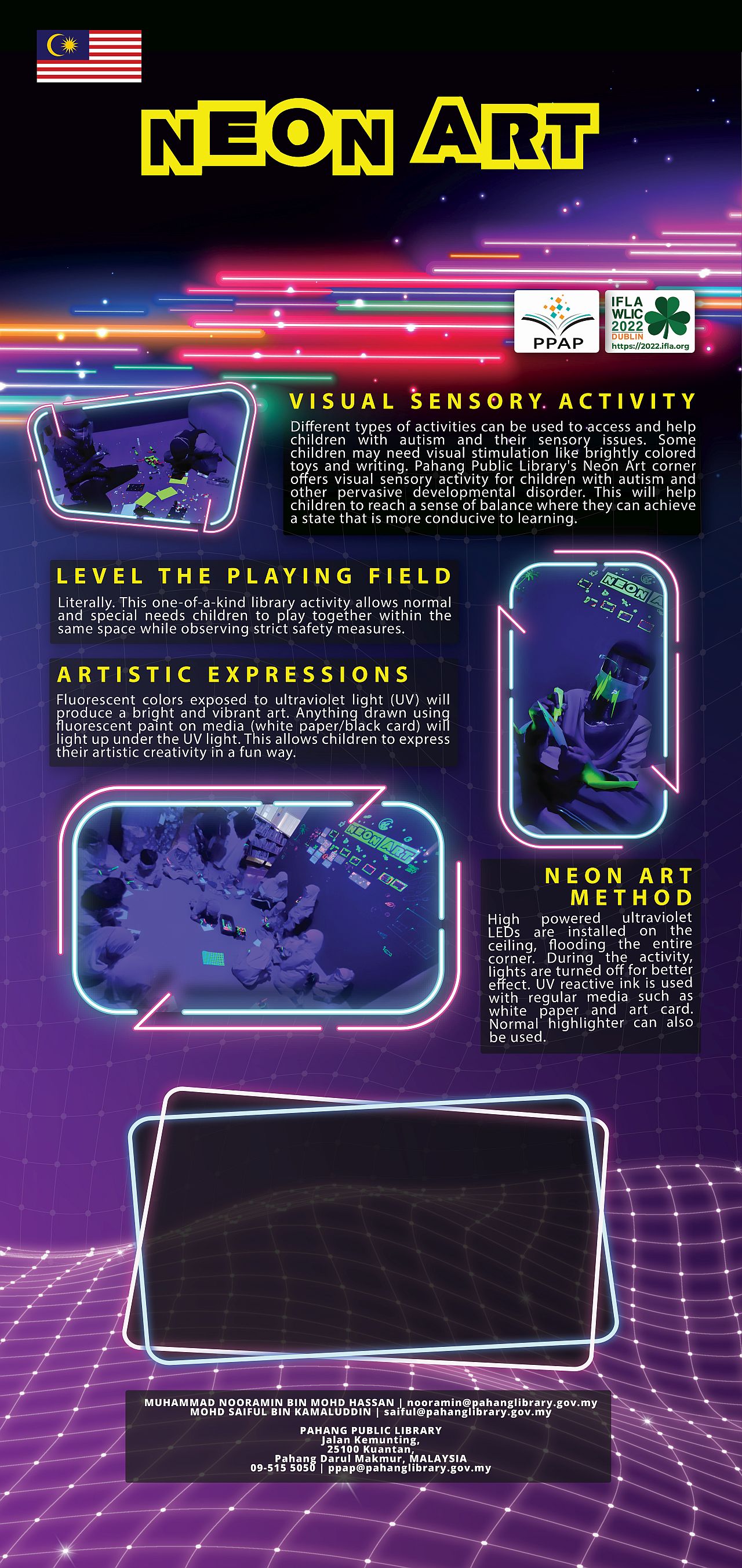After month of lockdown, public library need to come up with unconventional activities in order attract user back. Neon Art is a visual sensory activity with aim to promote the library to young readers through the wonders of science. The activities involve fluorescent paint with UV light produce a bright and vibrant art. Anything drawn using fluorescent paint on the supplied black card will lit up under the UV light. This allows children to express their artistic creativities in a fun way. Neon Art will also benefit children with autism and other pervasive developmental disorder as enhanced visual ques allows them to learn more quickly. Inspiring public libraries to engage even more community members. Neon Art are conducted with stringent safety protocols with face shields and gloves. In this challenging and uncertain times, innovative approach is needed to let the public know that the library is alive and well.