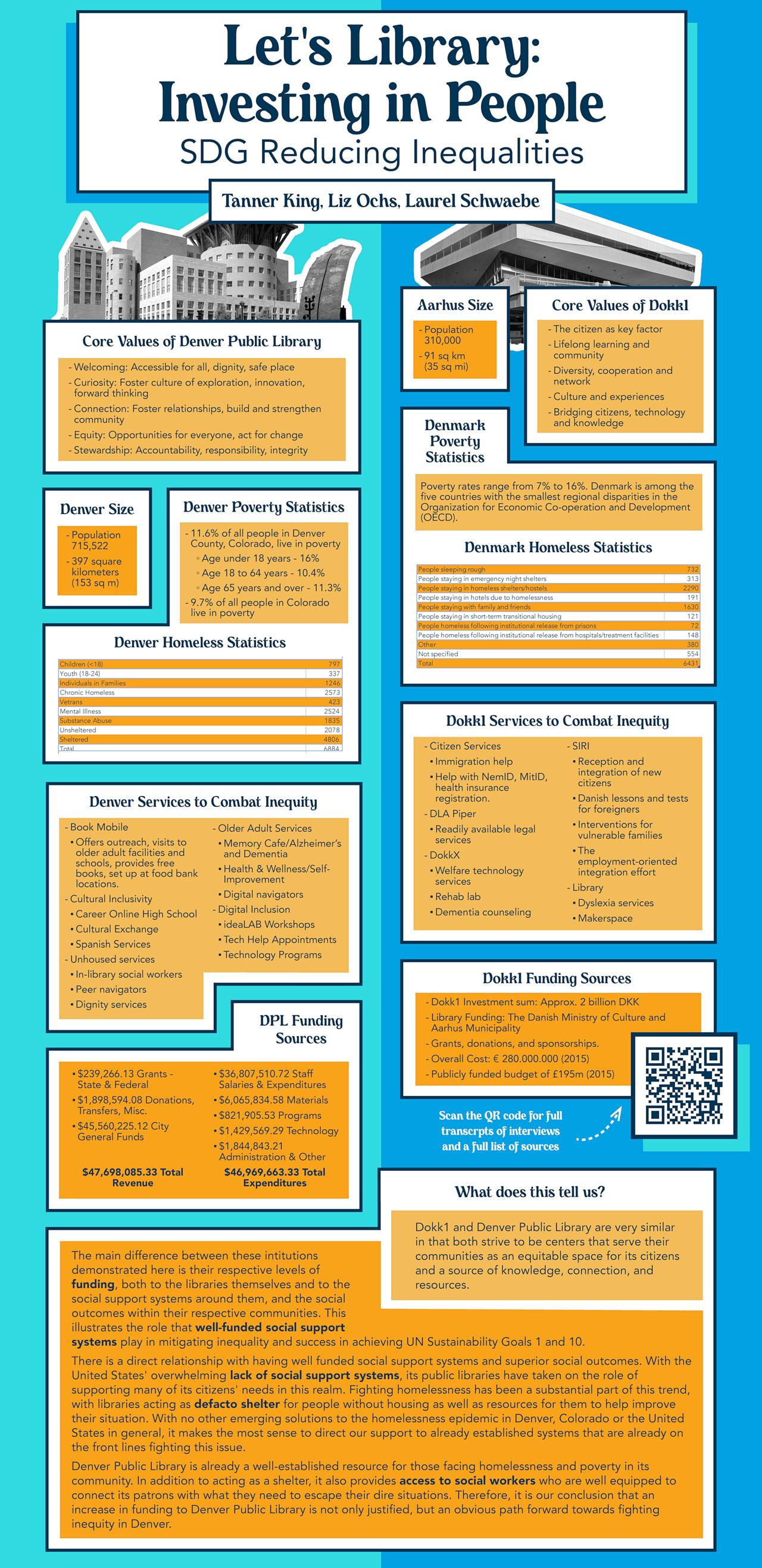 With the United States' overwhelming lack of social support systems, public libraries have taken on the role of supporting many of its citizens' needs. Fighting homelessness has been a substantial part of this trend, with libraries acting as de-facto shelter for people without housing as well as resources for them to help improve their situation. With no other emerging solutions to the homelessness epidemic in Denver, Colorado or the United States in general, it makes sense to direct support to systems that are on the front lines fighting this issue.