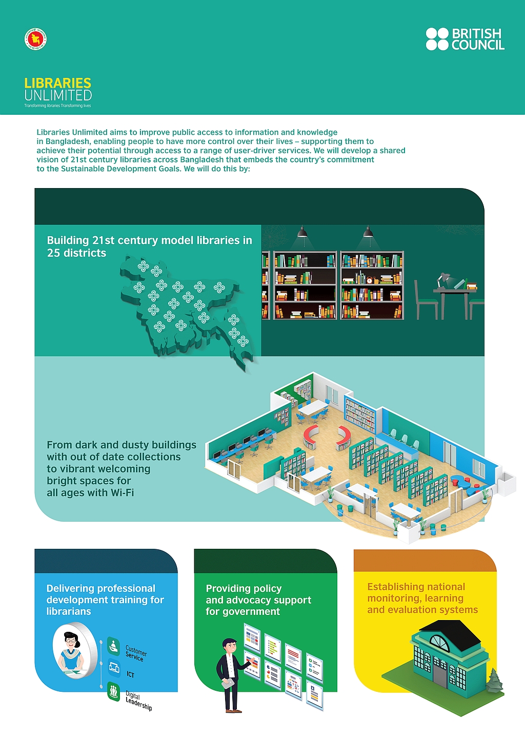 | dc.description.abstract | - Opening access to information and knowledge for all in Bangladesh. The Libraries Unlimited (LU) programme seeks to improve public access to information and knowledge, and has been designed based on the findings of the Library Landscape Assessment of Bangladesh study (June 2015). Developed in close partnership with the Government of Bangladesh, LU aims to modernise the public library network, build the capacity of government officers, train library staff, and build public awareness of and access to library and information services. The British Council is implementing this project in partnership with the Ministry of Cultural Affairs and is supported by the Department of Public Libraries. LU will give millions more people in Bangladesh, including groups such as women, young people out of education and employment, and micro-entrepreneurs, more control over their own lives thus supporting them to achieve their potential through access to a range of user-driven services by: 1. Provide policy and advocacy with local, regional and national government We are developing a shared vision of 21st Century libraries across Bangladesh that embeds the country’s commitment to the Sustainable Development Goals and provides communities with access to information, knowledge and skills development. 2. Upgrade library facilities We are upgrading ICT facilities and design new layouts to create contemporary multi-usage solutions that provide innovative learning environments. 3. Innovate services and increase library usage rates We are enabling public libraries to provide an increased number of locally-relevant services that meet the needs of their communities, along with a national awareness campaign. 4. Professional development for library practitioners We are training library staff to provide user-centred 21st century services and to become catalysts for change in their community. 5. Monitoring, learning, evaluation and best practice We are establishing national monitoring, learning and evaluation systems for libraries’ development process. | en |