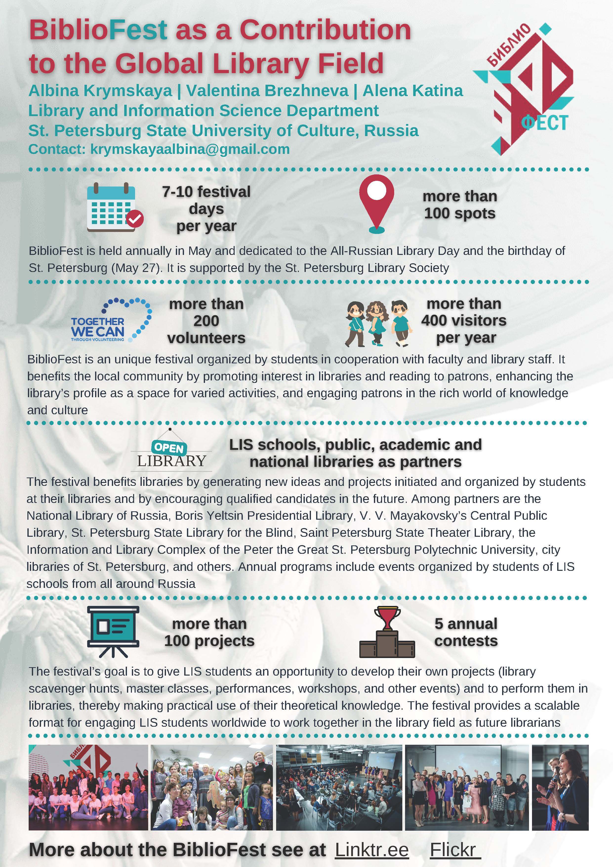 In 2013 the Library and Information Science Department (LIS) of the St. Petersburg State University of Culture (SPbGIK) initiated BiblioFest, an annual student library festival that offers two weeks of city-wide library-themed events created and executed by LIS students. As a basis for the professional development of future librarians, BiblioFest implements IFLA’s strategic directions: to inspire, engage, enable, and connect. By participating in BiblioFest, LIS students gain valuable experience and skills in 4 strategic areas:
