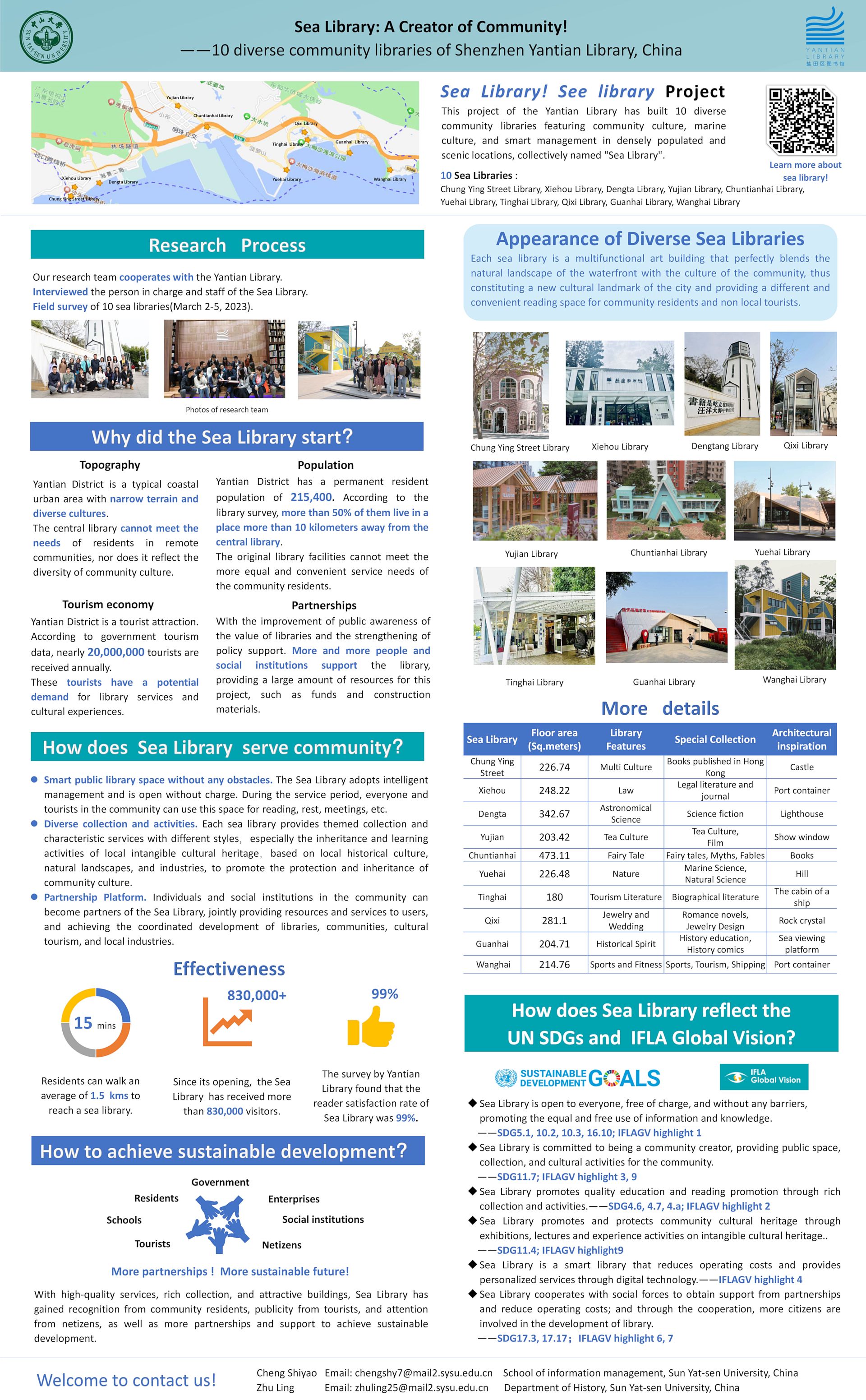The results are displayed in the poster, including Why did the Sea Library start?How does Sea Library serve community?Effectiveness?How to achieve sustainable development?Appearance of Diverse Sea Libraries?How does Sea Library reflect the UN SDGs and IFLA Global Vision? and so on.