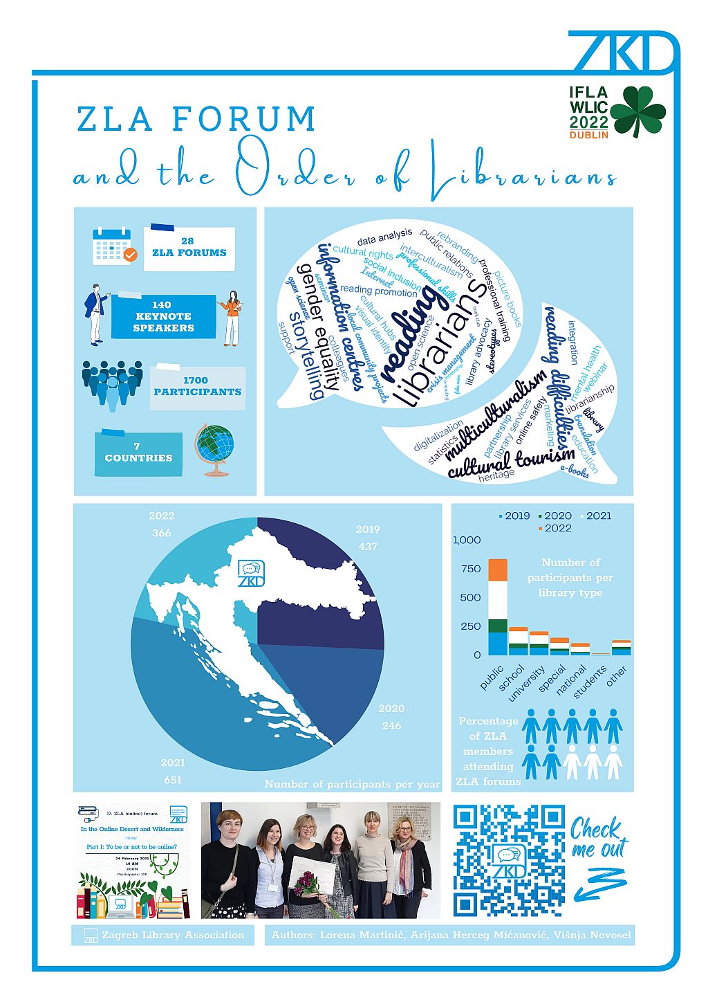 The ZLA and the order of Librarians poster presents the ZLA Forum development from its beginnings in 2019 until today. It was created as a way to connect and further educate the library community. The format is flexible and there have been different lectures, panel discussions and workshops. It has also changed from being physical to virtual and hybrid. While it was being held in person, the participants were librarians from Zagreb and the surrounding cities (8 Forums, 54 lecturers, 433 participants from 50 different cities). Due to the earthquake and the pandemic in 2020 there were several in person and online workshops with a lower number of participants (7 Forums, 245 participants). In 2021 the number of participants increased significantly because the Forum was held on Zoom (8 Forums, 719 participants) and the participants were from different parts of Croatia as well as neighbouring countries. The topics covered are related to library science, but also to areas which the lecturers work in (marketing, psychology, cultural heritage, tourism, EU projects, etc.). The Forum is created and organised by the ZLA members and is aimed at anyone interested. The poster gives a graphic representation of changes in the number of participants over the years.