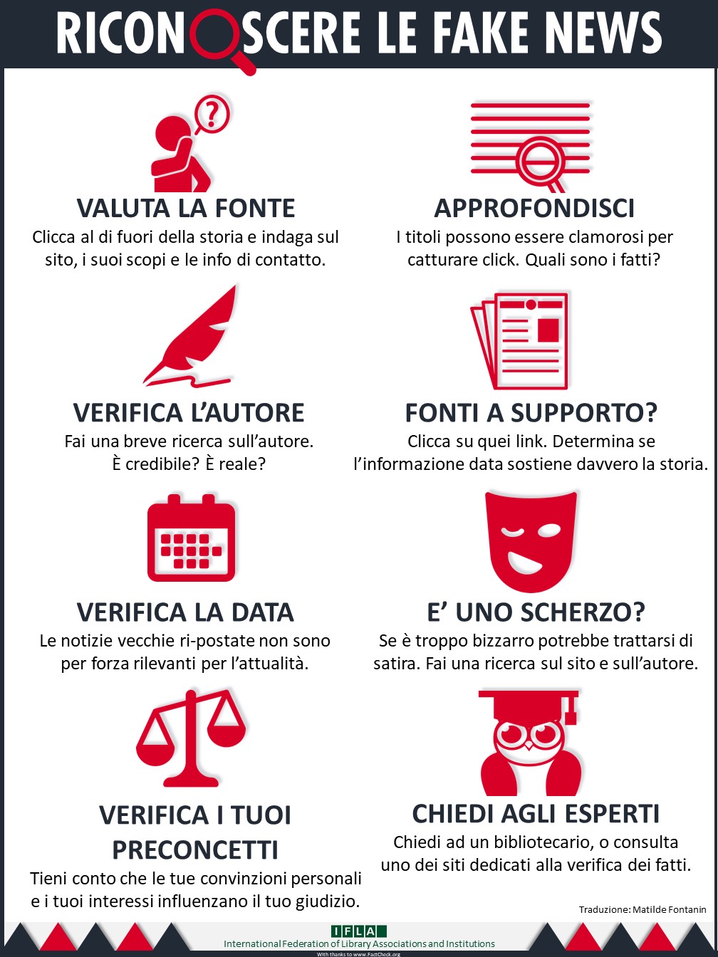 IFLA has made this infographic with eight simple steps (based on FactCheck.org’s 2016 article How to Spot Fake News) to discover the verifiability of a given news-piece in front of you. Download, print, translate, and share – at home, at your library, in your local community, and on social media networks. The more we crowdsource our wisdom, the wiser the world becomes.