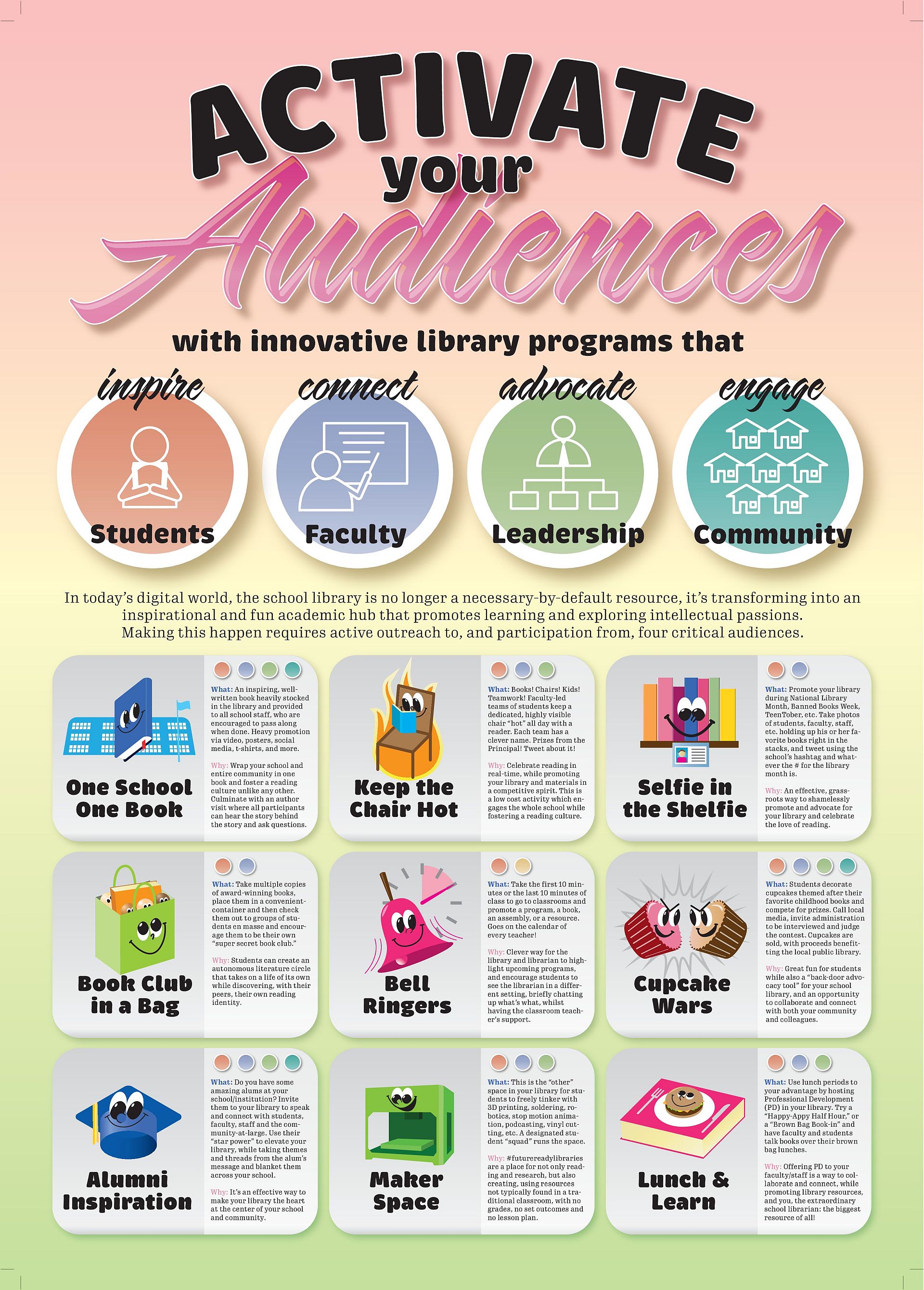 My poster presentation focuses on innovative library programs that foster an engaging and inspiring reading/research culture and how the role of the librarian has changed, as we now have to advocate for ourselves and our positions. This programming, in turn, is used as a back door advocacy tool to connect with the "powers that be." The paradigm has shifted; the school library has to become much more than it traditionally once was. Sadly, however, many school librarian positions are being eliminated across the globe. Decision-makers and lawmakers do not know the power and meaningful impact of a school library and a school librarian. School librarians need a booming voice and stalwart advocate to showcase their skills and their countless contributions. Our profession needs someone to be empowering so each of us can become crusaders in our schools. Using innovative library programming as an advocacy tool is a method that works, should be shared and celebrated by all librarians, and one that I speak to directly.