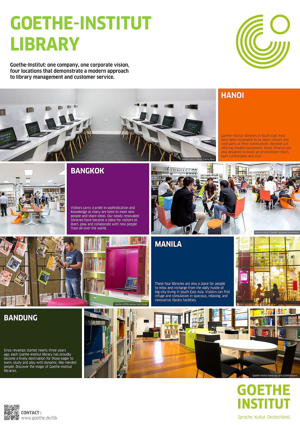 The libraries of Goethe-Institut in South-East Asia are incredibly vital. The visitors are mostly young and all of them are brought up in a very dynamic and lively environment. These young people are keen to learn, they love to meet people and they love to laugh. But the expectations of these well trained customers are high. Not only the technical equipment has to be fine and useful but the refurnishing should also be interesting and stimulating. The customers expect to get support for their language training but also want to relax from the busy cities. All this requires innovative concepts of space design. The Goethe-Institut South-East Asian libraries have been over the last two years actively fulfilling their needs. Visit the redesigned libraries of Goethe-Institut Bangkok, Hanoi and Bandung in their historic buildings which are uniquely in contrast with the library of Goethe-Institut Manila in the ultramodern business center. Furthermore, our poster will show you the fantastic and different space concepts. Dive in to our magic cardboard and discover these libraries by yourself. Meet the comic and gaming enthusiasts in Bangkok and Bandung, participate with the language students the learning hub in Hanoi, and relax in Manila.