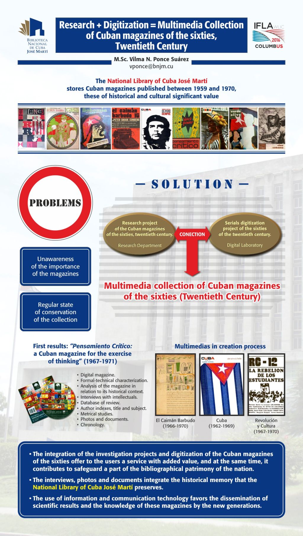 La Biblioteca Nacional de Cuba José Martí atesora las colecciones de revistas cubanas del periodo 1959-1970. A pesar de su valor histórico – cultural, muchos jóvenes no las conocen, o no las pueden consultar por el deterioro del papel. El propósito del póster es mostrar las acciones iniciadas por la institución para darle solución a estas problemáticas. La tarea principal fue la conexión de dos proyectos que se desarrollaban de manera independiente: el estudio de las revistas cubanas de los años sesenta, en el Departamento de Investigaciones, y la digitalización de las publicaciones seriadas de esa etapa, por el Laboratorio Digital. El resultado fue la creación de la “Colección de multimedias de las revistas cubanas de los años sesenta, siglo XX”, de la cual ya se obtuvo un primer producto y dos están en proceso.