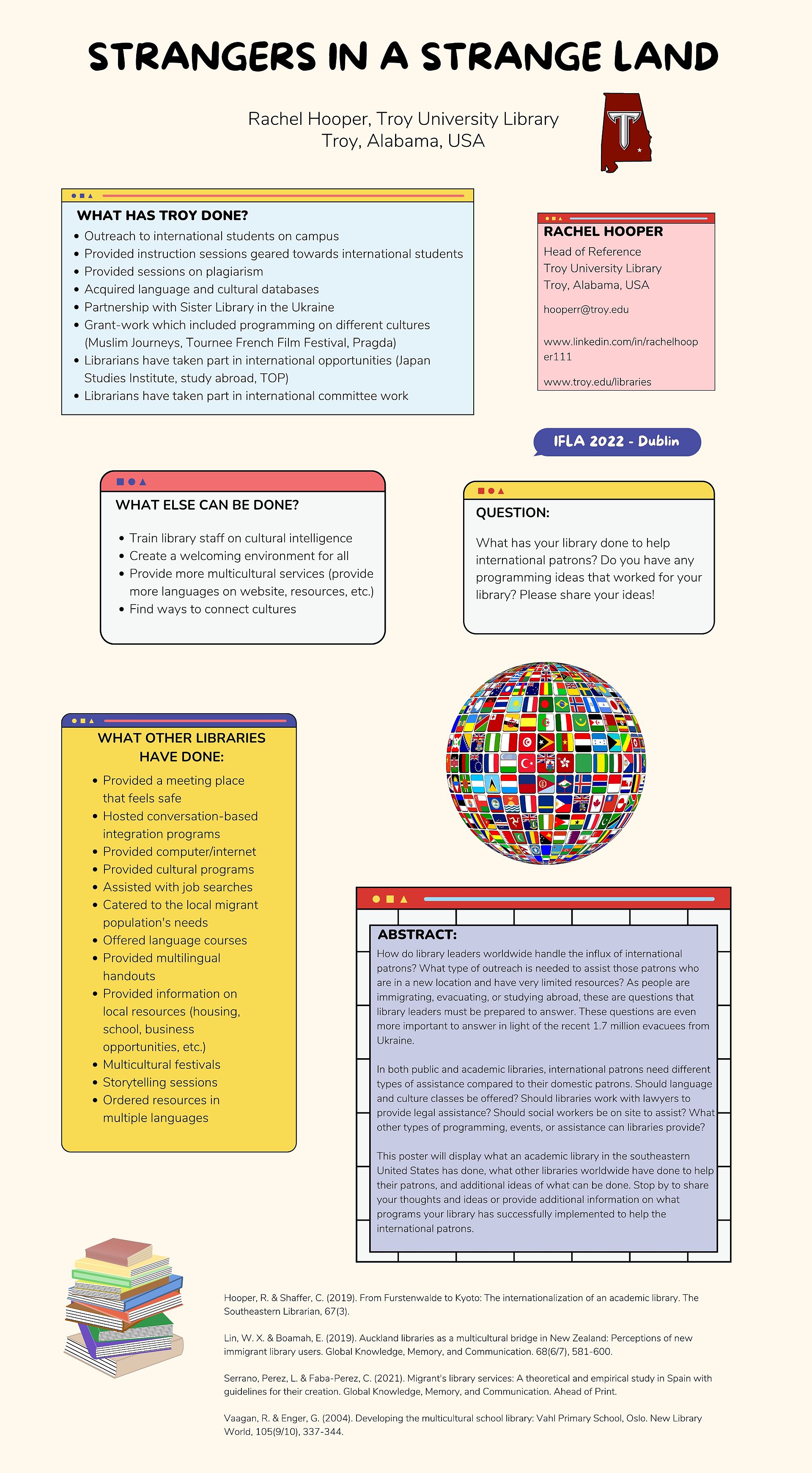 How do library leaders worldwide handle the influx of international patrons? What type of outreach is needed to assist those patrons who are in a new location and have very limited resources? As people are immigrating, evacuating, or studying abroad, these are questions that library leaders must be prepared to answer. These questions are even more important to answer in light of the recent 1.7 million evacuees from Ukraine. In both public and academic libraries, international patrons need different types of assistance compared to their domestic patrons. Should language and culture classes be offered? Should libraries work with lawyers to provide legal assistance? Should social workers be on site to assist? What other types of programming, events, or assistance can libraries provide? This poster will display what an academic library in the southeastern United States has done, what other libraries worldwide have done to help their patrons, and additional ideas of what can be done. Stop by to share your thoughts and ideas or provide additional information on what programs your library has successfully implemented to help the international patrons.