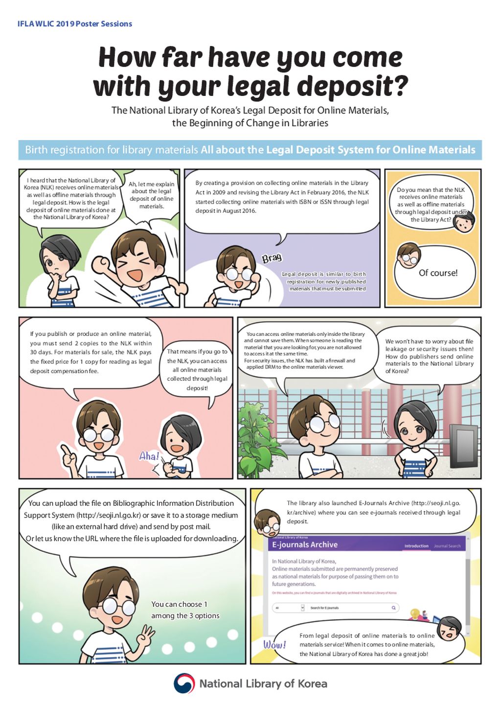 With a picture of the registration page where publishers can upload legal deposit files and detailed explanation on the legal deposit method and procedure, the poster provides a clear understanding on Korea’s systematic collection system for documentary heritage.