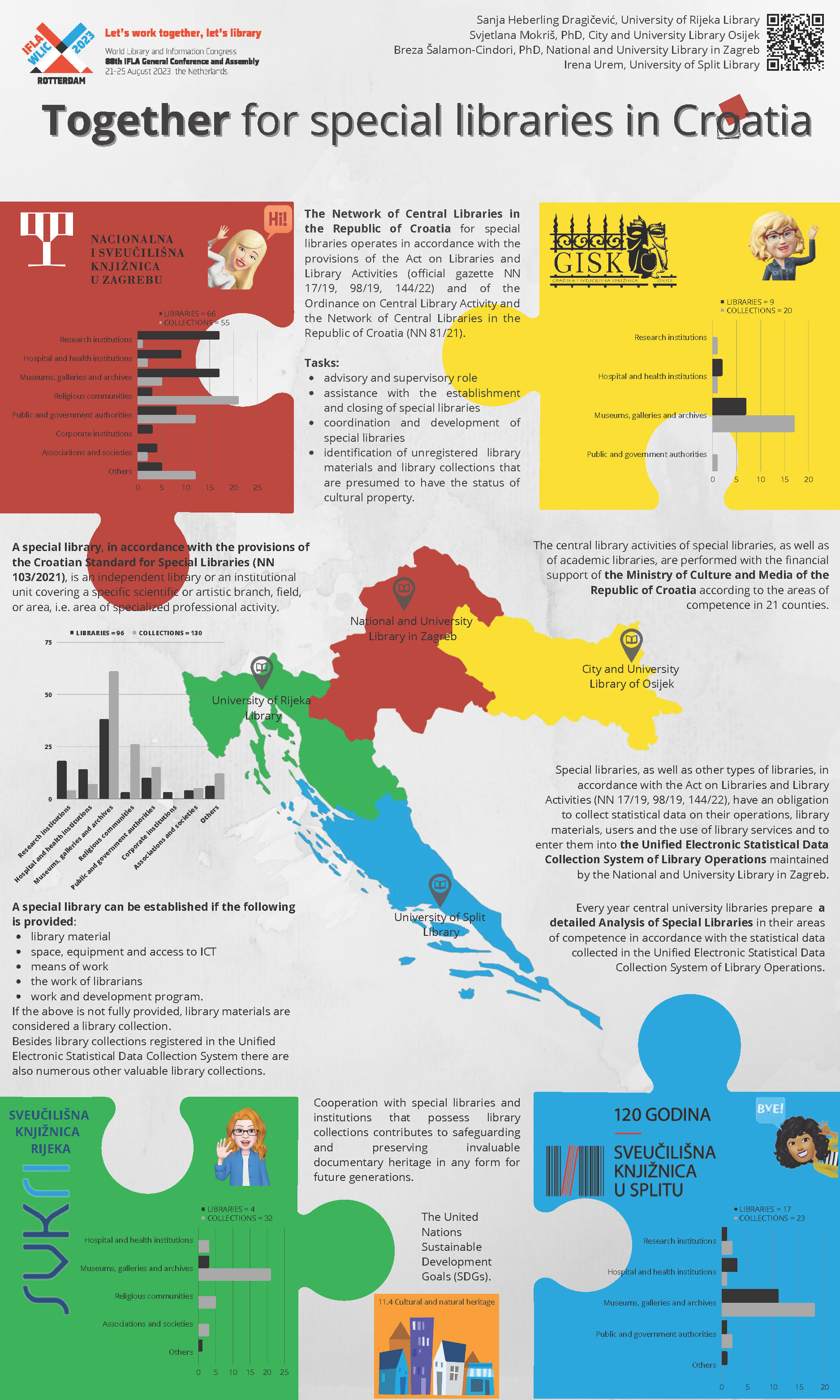 According to the Croatian Standard for Special Libraries, published in 2021, a special library is an independent library or an institutional unit covering a specific scientific or artistic branch, field, or area. In Croatia, special libraries include libraries of research institutions, hospital and health institution libraries, museum libraries, gallery and archive libraries, religious community libraries, libraries of public and government authorities, corporate libraries, libraries of associations and societies and other libraries. Each of them has an essential role in safeguarding and preserving invaluable documentary heritage.