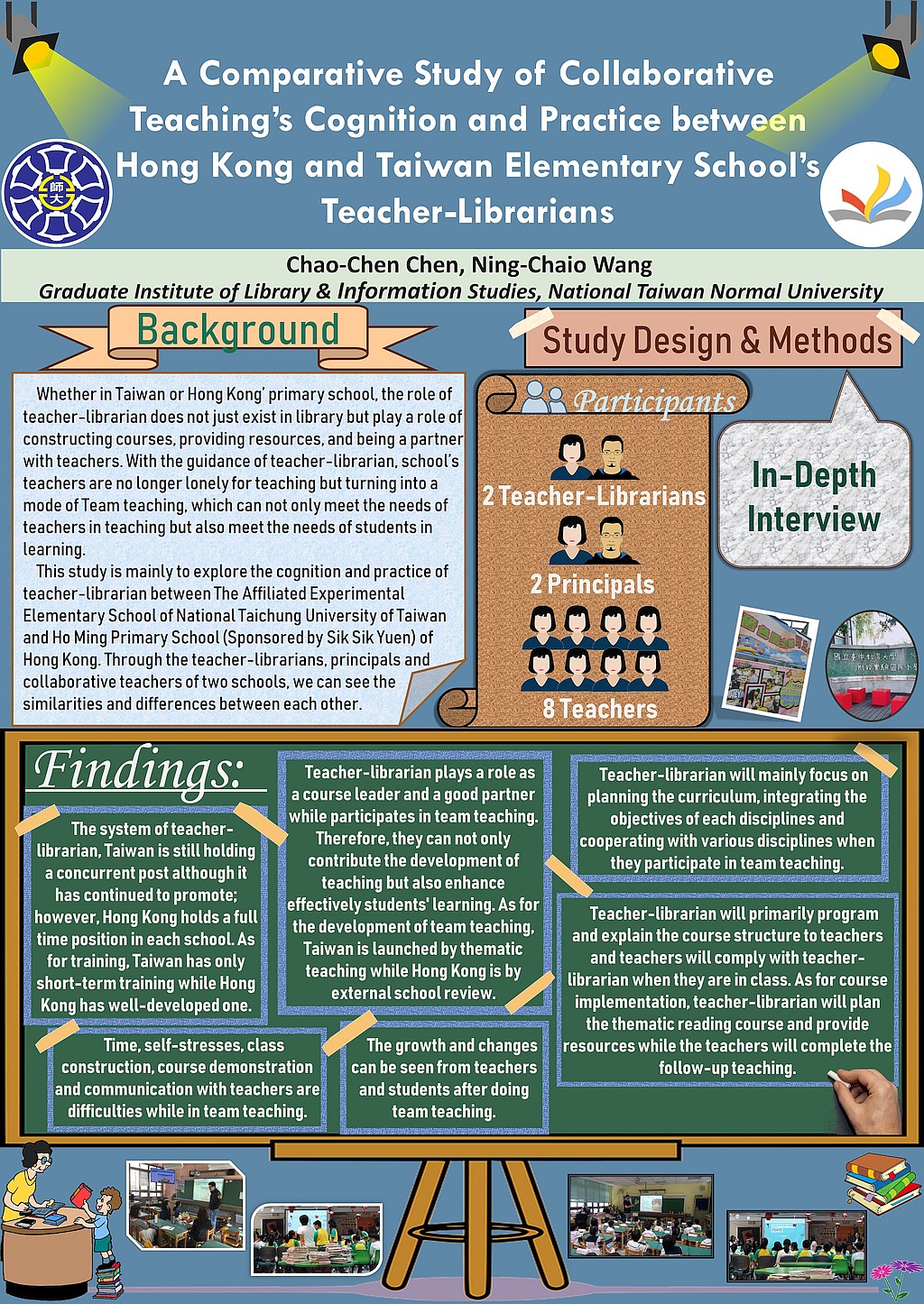 Whether in Taiwan or Hong Kong’ primary school, the role of teacher-librarian does not just exist in library but play a role of constructing courses, providing resources, and being a partner with teachers. With the guidance of teacher-librarian, school’s teachers are no longer lonely for teaching but turning into a mode of Team teaching, which can not only meet the needs of teachers in teaching but also meet the needs of students in learning. This study is mainly to explore the cognition and practice of teacher-librarian between The Affiliated Experimental Elementary School of National Taichung University of Taiwan and Ho Ming Primary School (Sponsored by SikSikYuen) of Hong Kong. Through the teacher-librarians, principals and collaborative teachers of two schools, we can see the similarities and differences between each other.