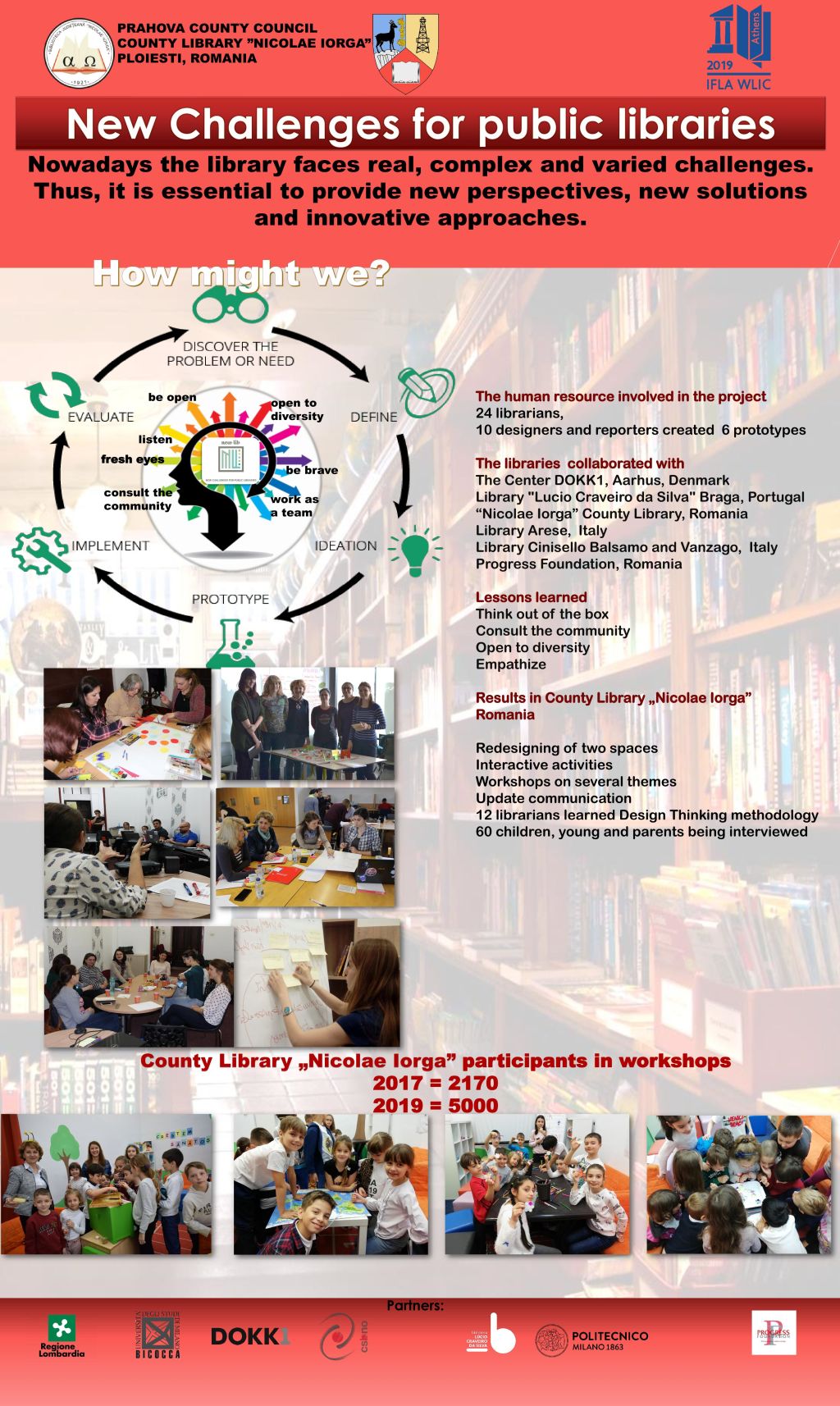 The ”Nicolae Iorga” Public County Library currently has rearranged two spaces and has five new services, after using the Design Thinking methodology. The number of workshop participants has risen by 29%. Of the 80 public libraries that are coordinated, 10 have developed new services.