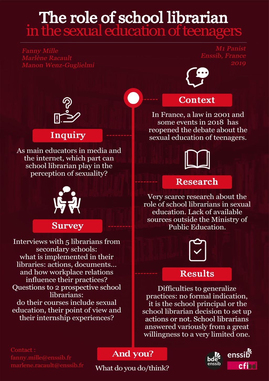 With the increasing ease of access to sexual content on the internet, the sexual education of teens is becoming more than ever an important issue. In France, sexual education has been included in school’s curriculum since 2001 and the school librarian plays an important role in informing and raising students’ awareness on many topics, including sexuality.