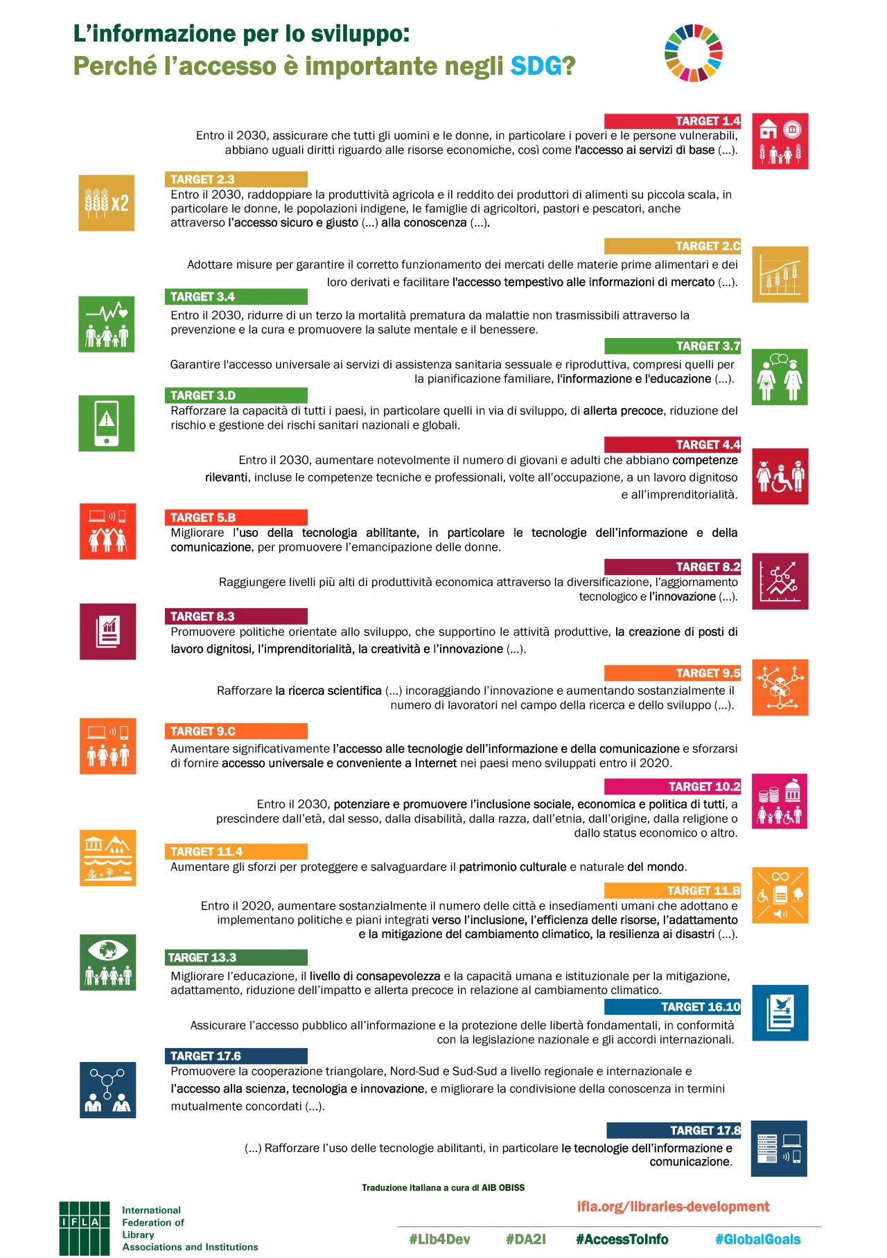 When the United Nations Member States agreed the 2030 Agenda, they recognised that without specific targets and a framework for measuring progress, the Sustainable Development Goals (SDGs) would be meaningless. As a result, connected to the 17 headline goals, there are 169 targets and 232 indicators that will allow us to know how further we have got towards their achievement. Although all goals are interconnected and the work of libraries contributes to all of them, some of these targets are particularly more relevant to the library and information field. This infographic offers a list of 20 selected targets across the SDGs with a closer relation to access to information and libraries. We hope this list can be helpful for your advocacy and awareness-raising work - for example you can talk about how your library contributes to each of these, or refer to specific targets when writing to governments or other stakeholders. It can also provide inspiration for preparing and submitting your SDGs Story to the IFLA Library Map of the World.
