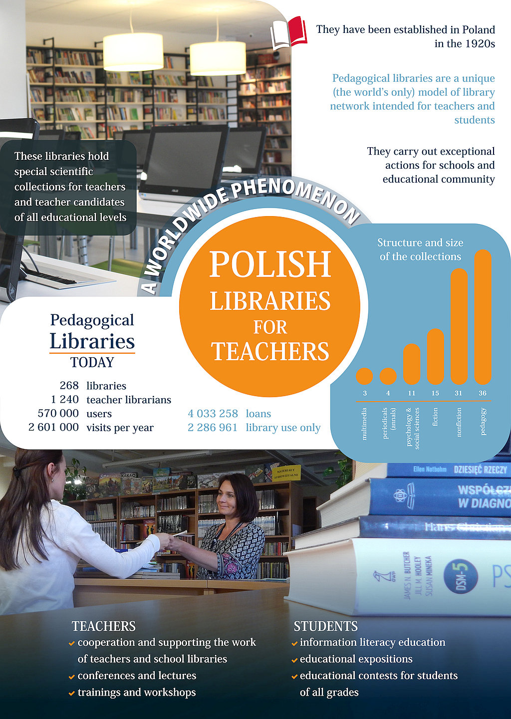 Pedagogical libraries are an unique (the world’s only) model of library network intended for teachers and students. They have been established in Poland in the 1920s. These libraries hold special scientific and pedagogical collections for teachers and teacher candidates of all educational levels. The network of pedagogical libraries consists of 268 libraries with combined number of users approximately 570 000. Our main goal is to support schools and educational community. For students of all grades (including preschoolers) we organise special lessons, information literacy and information technology education, as well as contests for students. Teachers are honoured users in pedagogical libraries. They can participate in various conferences, lectures, workshops and self-development networks.