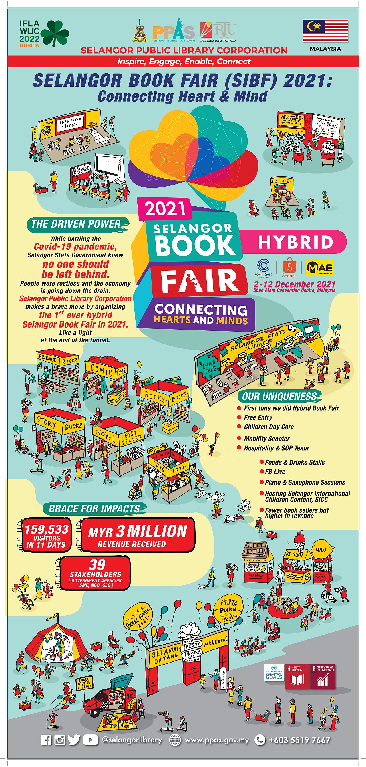 The fortunes of books supplier during this uncertain time is unpredictable due to the unstable economic condition. Themed "Connecting heart and mind" Selangor Public Library organized Selangor Book fair to jump start book retailer by implemented in a hybrid manner as a symbolic gesture that with every hardship comes ease. This collaborative effort clearly holds IFLA strategic direction to connect and empower the field of library by organizing book fair to fuels book industry in Selangor. The Selangor Book Fair 2021 (SBF2021), which took place in city of Shah Alam was a fantastic event that fuelled Selangor's economic engine and allowed those in the book and stationery industry to jump-start their businesses during the uncertain time. This book fair also provides disabled friendly facilities with additional mobility scooter for extra attention for those in need. This 11 days yearly event attracted more than 159,000 Visitors in 2021 and participating 121 book seller and spreading 152 booth at Shah Alam Convention Centre ( SACC ). Although this book fair was organized in a smaller scale, most of the seller reach their target and overwhelmed by the support of community and the state government.