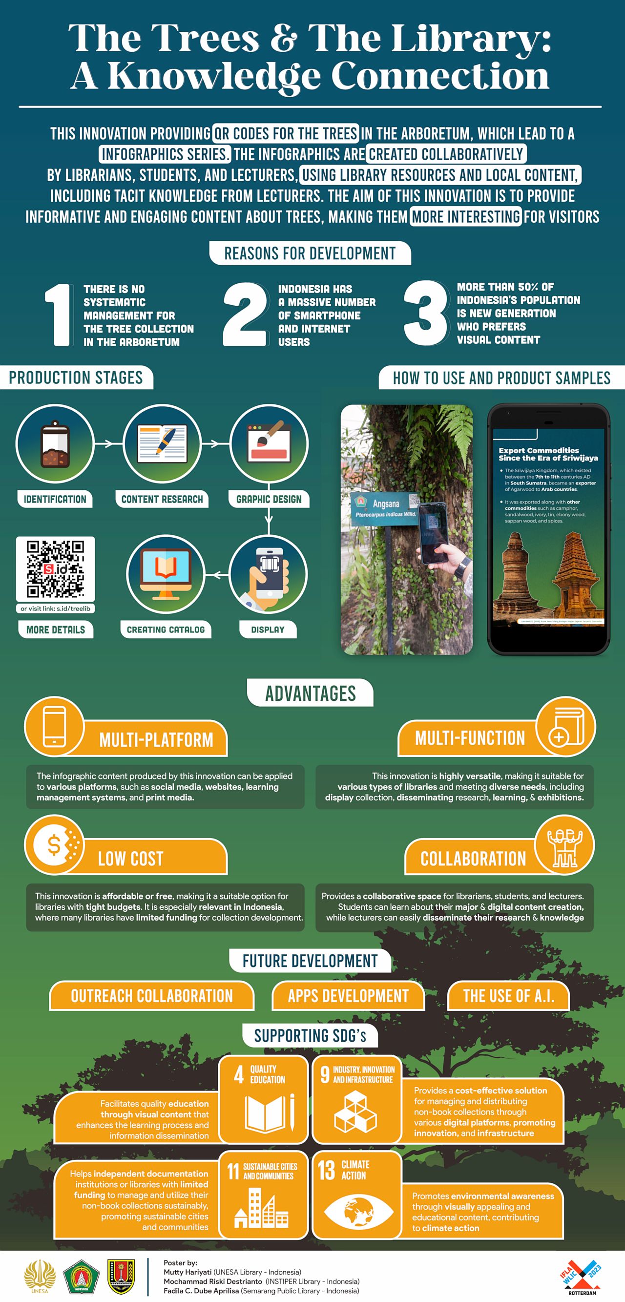 This innovation provides QR codes for the trees in the arboretum, which showcase a series of portrait-sized infographics. These infographics are crafted using sources from library collections and local institutional knowledge, including tacit knowledge. The QR codes containing the infographic series can be easily accessed by scanning. This innovation has five stages: 1) Identification, 2) Content Research, 3) Graphic Design, 4) Display, and 5) Catalog Creation.