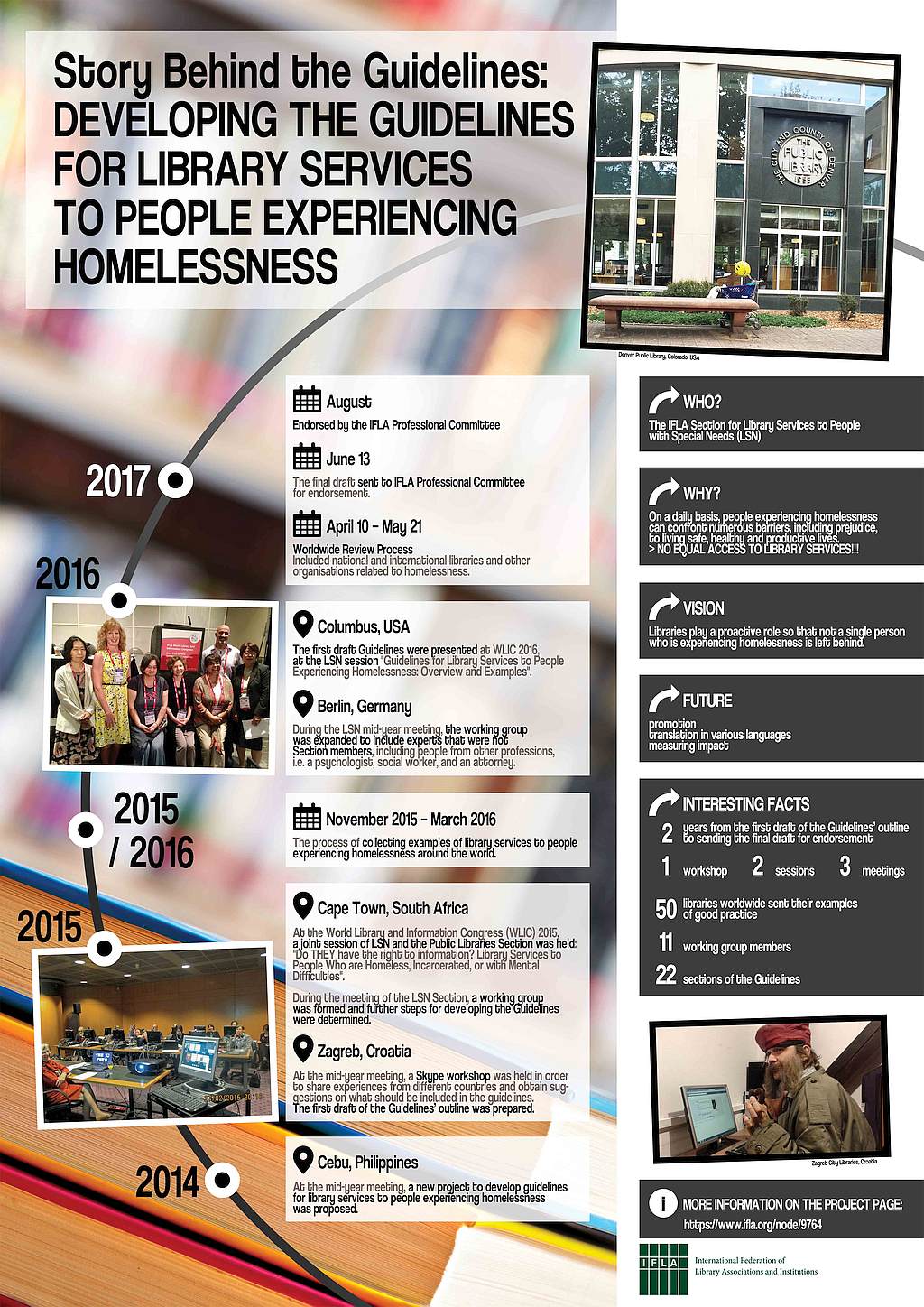 The interesting and challenging process of developing IFLA guidelines is hidden from the eyes of most readers. The aim of this poster is to illustrate the process of the development of guidelines, using the example of the Guidelines for Library Services to People Experiencing Homelessness. Over the years, the Section for Library Services to People with Special Needs (LSN) has taken different steps in the development of these guidelines. Homelessness is an extreme form of poverty and a fact of life in all countries of the world, regardless of the level of development of their economic or governance systems. Libraries are an important part of the organizational network that can empower people experiencing homelessness and provide them equal access to information, skills, and knowledge. In the development of these Guidelines, there were contributions from experts that were not Section members, including people from other professions, i.e. a psychologist, social workers, an attorney, as well as a person experiencing homelessness. Examples of good practices from more than fifty libraries worldwide were collected. The most important information and steps of the development of the Guidelines will be presented using a timeline, photographs and information graphics.