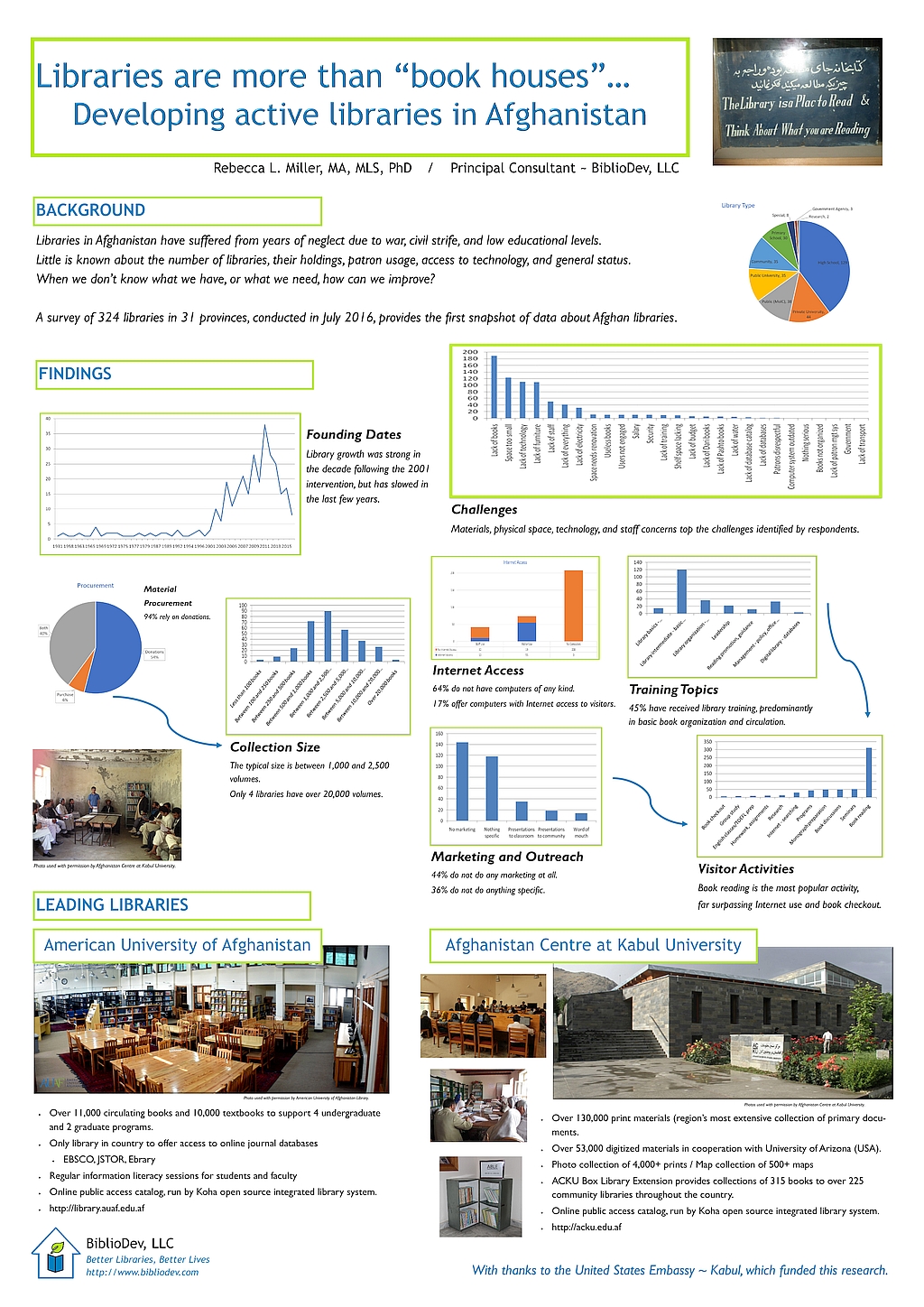 The word for “library” in Dari, one of the national languages of Afghanistan, is “kitab-e khaana” or “book house.” Unfortunately, this has come to connote warehouse more than a home, nothing more than a space to store books and not a vibrant source for information seekers. Afghan libraries have a long way to go to overcome years of neglect, yet a few are managing to become a strong foundation for literacy and research. A recent survey of 324 libraries in Afghanistan conducted by the author showed that shortages of appropriate books, lack of Internet access (even lack of basic utilities), and untrained library staff hamper the development of libraries as access points to information crucial in a developing nation. However, a few libraries are leading the way forward. This poster will present information about the Afghanistan Centre at Kabul University (ACKU), the American University of Afghanistan (AUAF) library, and the Lincoln Learning Centers system of libraries across Afghanistan. Graphs and figures will summarize pertinent data from the survey. Color photographs will illustrate brief text statements describing the libraries mentioned and comparing them to examples of more typical Afghan libraries.