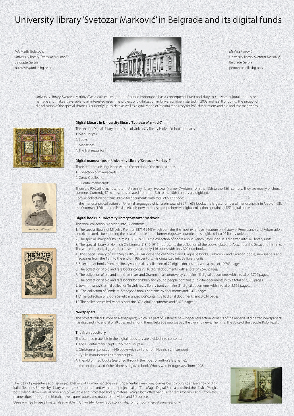 heritage and makes it available to all interested users. The project of digitalization in University library started in 2008 and is still ongoing. The project of digitalization of the special libraries is currently up-to-date as well as digitalization of Phaidra repository for PhD dissertations and old and rare magazines.