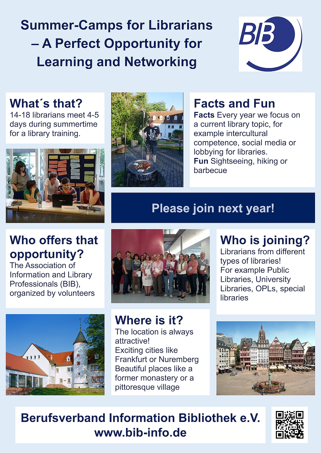 To make library training attractive and efficient, the Association of Information and Library Professionals (BIB) in Germany offers multiple formats. The most exceptional one is the annual summer-camp which celebrates its 20th jubilee in 2017.