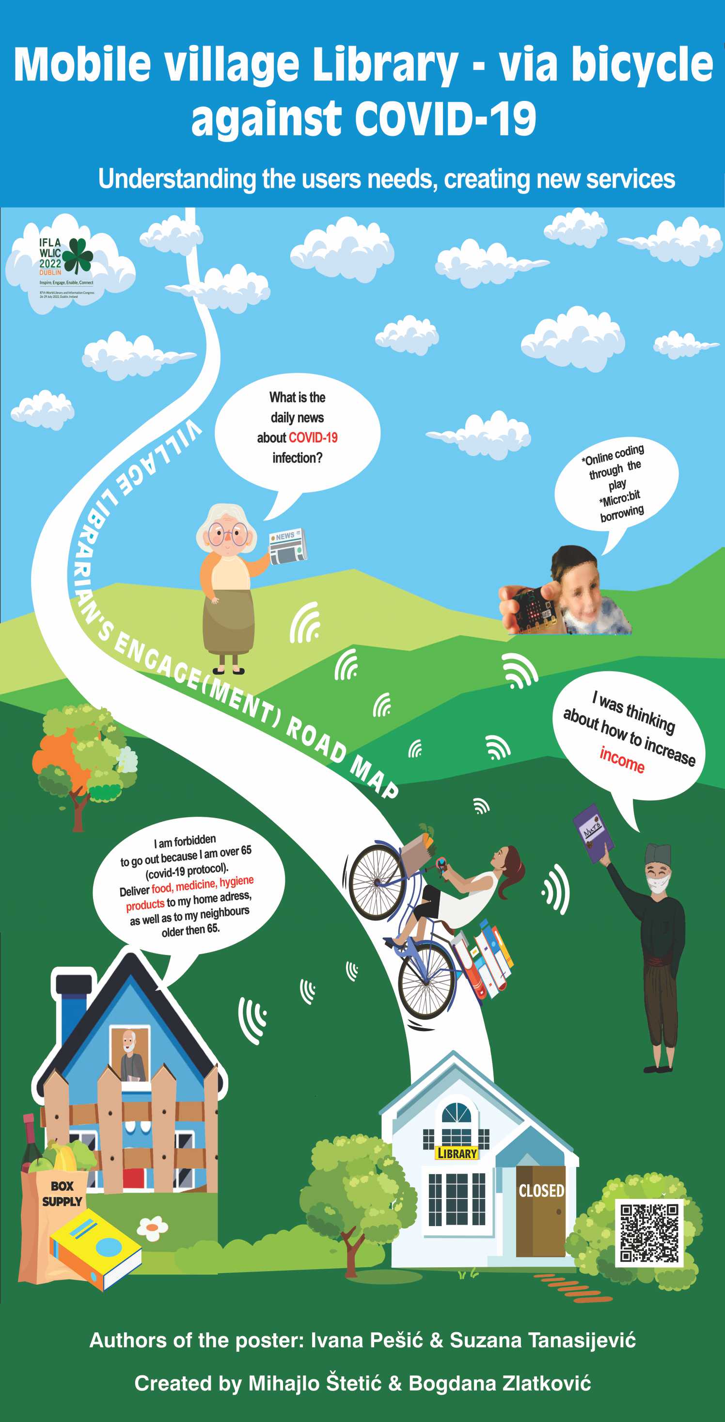 The basic idea of the Mobile libraries is to bring resources outside of the physical location of the library to the users who would not otherwise have the opportunity to benefit from them. In 2015, the village librarian Ruzica Popovic created a free mobile library wheeled by bicycle. During the COVID-19 pandemic, this library service went beyond the walls. Libraries had to transform and adapt their activities to new circumstances. In the beginning, she only delivered library material. After learning that some old and sick inhabitants of the village are not able to procure medicines, she began to procure and deliver medicines for them. Also, she started to supply the same population with food, vegetables and fruits. Enthusiasm and desire to help inhabitants always and at every opportunity, makes this librarian, from a small village in Serbia, the greatest example of what a library really is and what it can be in the future. Providing library services via bicycle is an outreach initiative that has appeared in cities around the world. Despite this effect in the urban environment, the mobile bicycle library is an unknown activity in the Serbian librarianship.