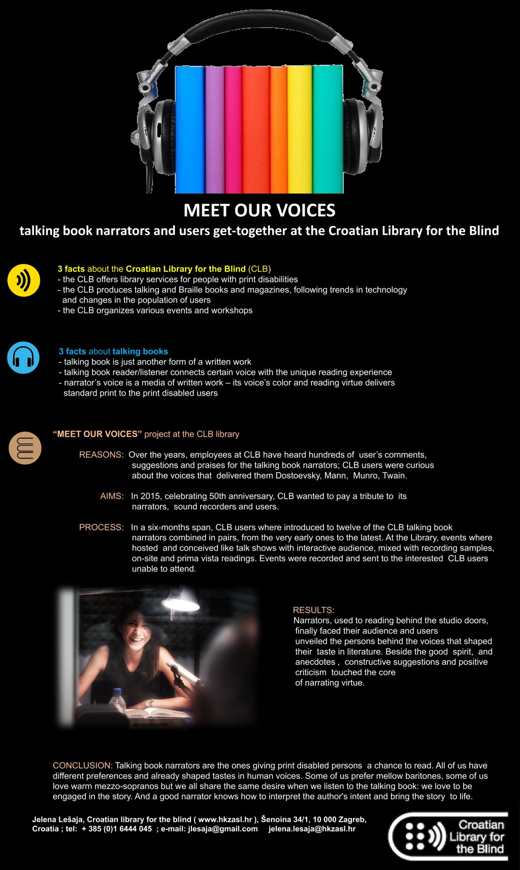 Croatian Library for the Blind (CLB further on) offers library services for people with print disabilities. Library produces Braille and talking books and magazines and organizes various events and workshops. For listener, narrator’s voice is a media of written work – its color and reading virtue delivers standard print to the print disabled user. Talking book narrators are the ones giving print disabled persons a chance to read. All of us have different preferences and already shaped tastes in human voices but we all share the same desire when we listen to the talking book: we love to be engaged in the story. In 2015, celebrating 50th anniversary, CLB wanted to pay a tribute to its narrators, sound recorders and users. Over a six-month span, CLB users where introduced to the CLB talking book narrators. CLB narrators, used to reading behind the studio doors, finally faced their audience and users unveiled the persons behind the voices that shaped their taste in literature.