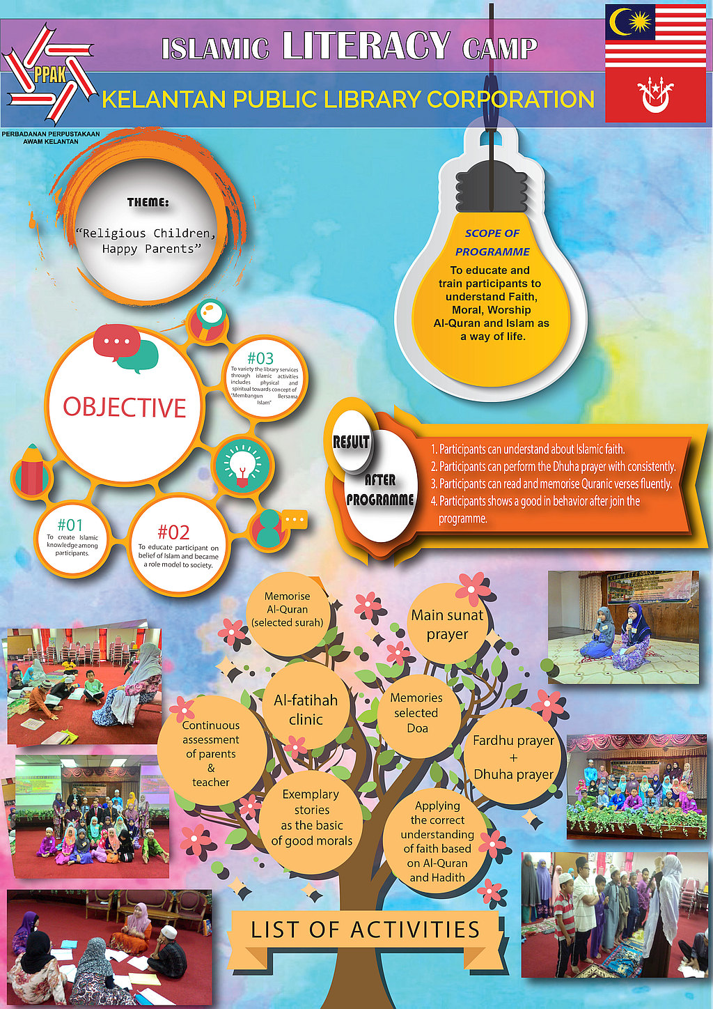 This paper describe about the Islamic Literacy Camp that has been conducted by Kelantan Public Library Malaysia. This Program are create to educated children from primary school to understand and practices the Islamic spirit that could become a role model in the society. From this program we could create variety of service in the library and change the view of people think about library. Before this, people just look library as place to read the book but through this program the people start change their perception and look the library as the place that could do more than read the book. Library has create the module for this program that suitable with Islam religion and suitable to student level. We hope from this program library can help people to create culture that has good attitude that follow the Islamic way.