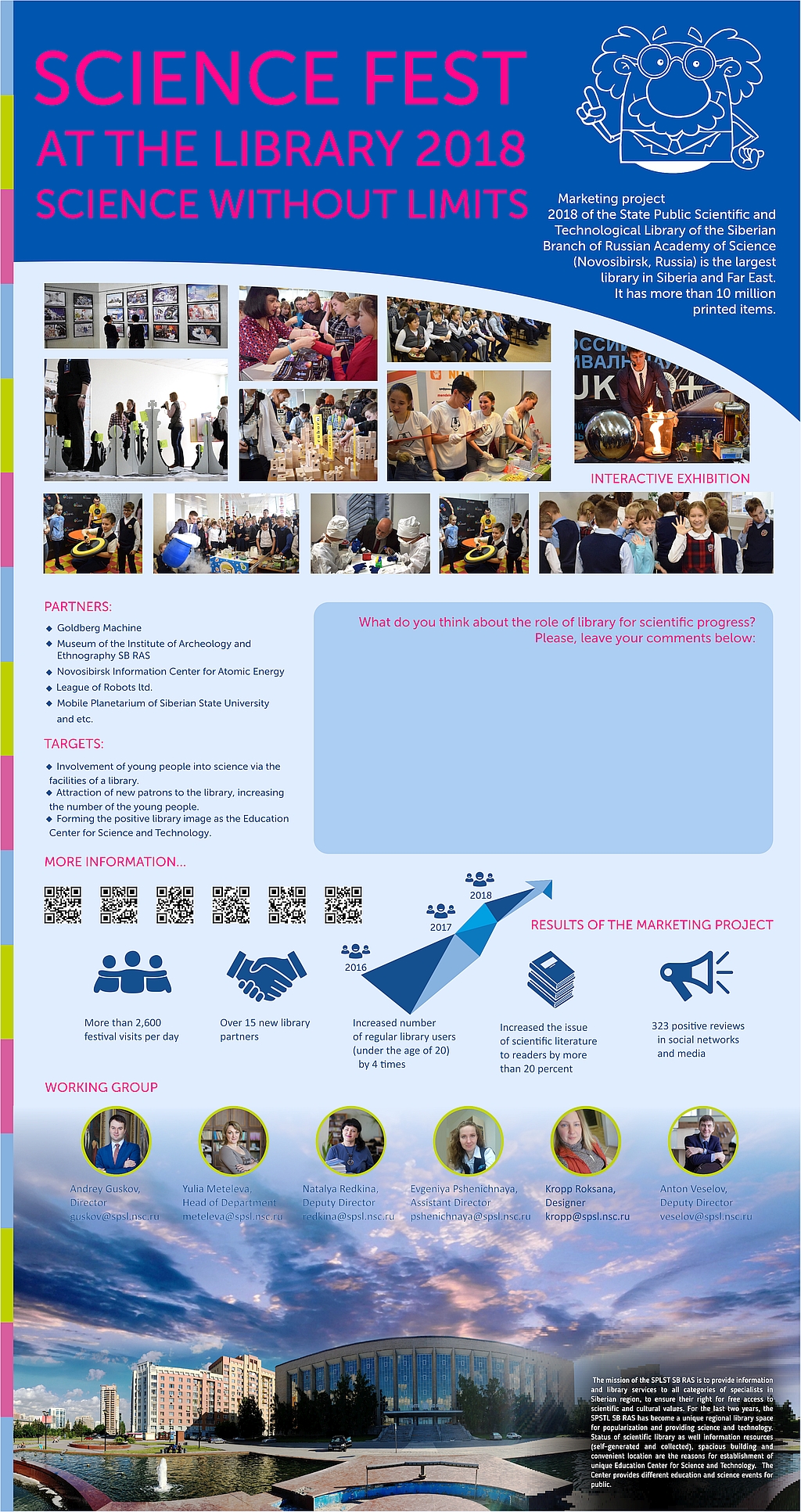 The poster for IFLA Poster Session-2019 presents one of the SPSTL SB RAS marketing projects «SCIENCE FESTAT THE LIBRARY»