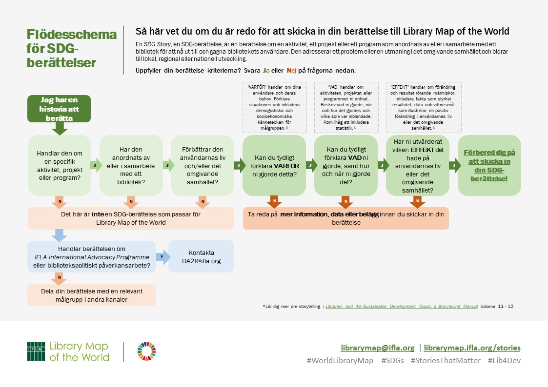The Sustainable Development Goals (SDGs) continue to be a major focus of IFLA’s advocacy work. We use SDG stories to demonstrate how libraries contribute to the SDGs and serve as partners in meeting local development needs. Stories are essential to raise awareness, change attitudes and mobilise. The IFLA Library Map of the World – a unifying platform providing access to SDG stories from different countries – is looking for more stories about impactful activities, projects and programmes, implemented by libraries or in partnership with libraries, addressing community needs. This flowchart will help you to better understand if your story is suitable for the Library Map of the World, to check if you have all elements you need and if you are ready to submit it!