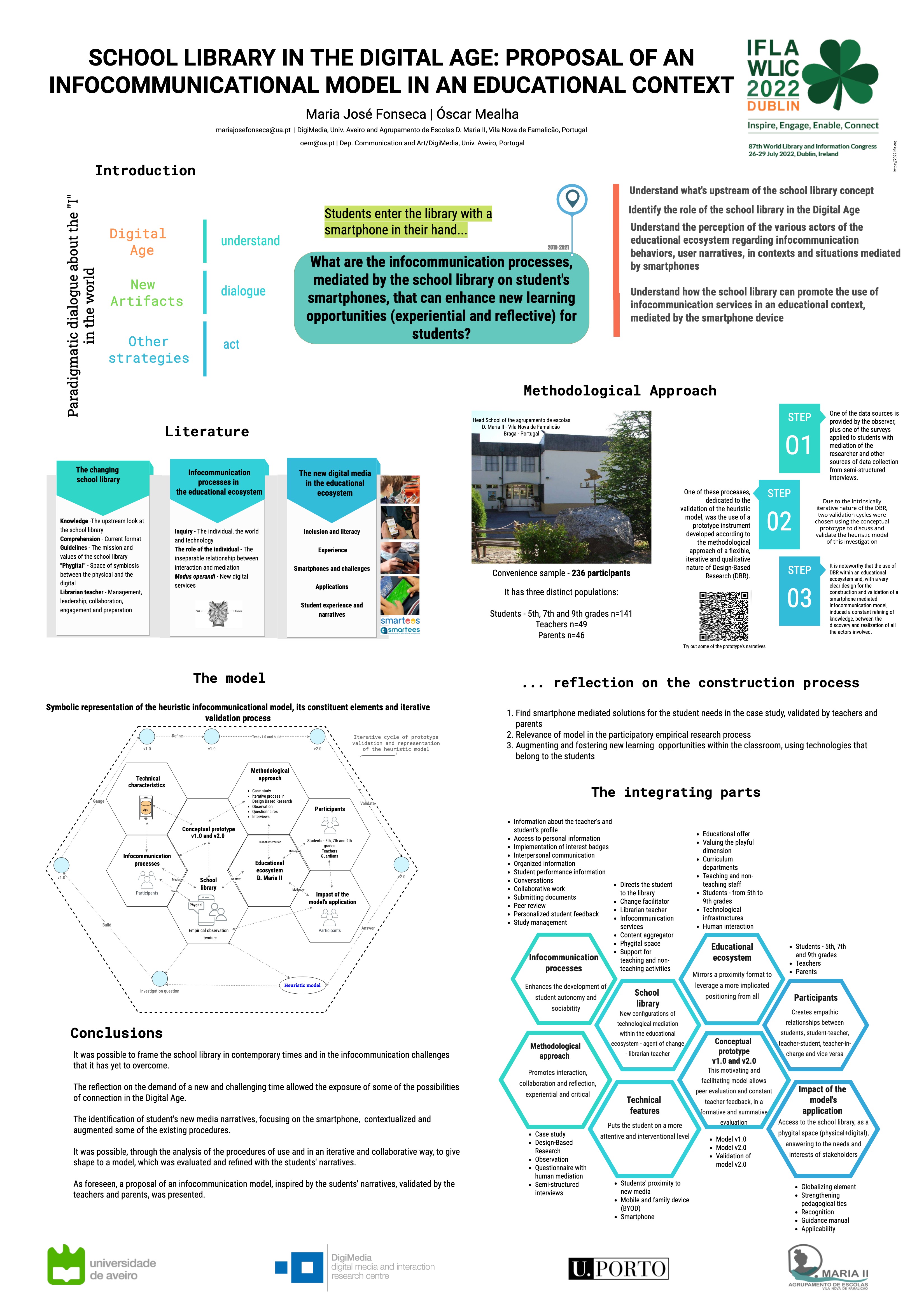 | dc.description.abstract | The investigation takes place in the natural environment, the school library, from 2019 to 2021, with an intended sample of 236 participants, students from the 5th, 7th, and 9th grades, teachers, and families, of the Head School of the agrupamento de escolas D. Maria II in Vila Nova de Famalicão - Portugal, intending to understand this case, this situation, in this context and in different infocommunication situations. In the light of the infocommunication paradigm, it is considered necessary to act; enhancing safer, contextualized, and timely changes, where the school library as a phygital space (physical +digital) assumes a central and updated role in the educational ecosystem. Supported by the Case Study, the methodological approach is of a flexible nature, iterative and qualitative, guided by the Design-Based Research, allowing the constant refinement of knowledge, between discovery and accomplishment. The study leading to the final proposal of a smartphone-mediated infocommunication model is supported by the literature review through bibliographic research and, a case study, in which the researcher has a close relationship with the context. It includes as technical procedures the participant observation, present across the whole process, online questionnaires applied with human mediation, allowing to know the procedures of use in smartphone inside and outside the educational ecosystem, and semi-structured interviews considering the interests and needs of the different stakeholders within the educational ecosystem. The results show that the identified features indicate an infocommunication model that promotes more intuitive, fast, attractive, and rewarding learning environments, that can allow interaction with different "actors" inside and outside the school, in a concept of just in time, anytime and anywhere, in this case, through smartphones. Keywords: School library, infocommunication process, smartphones | en_US |